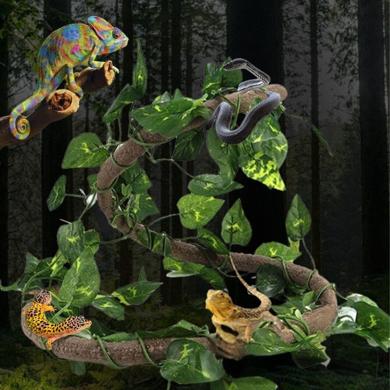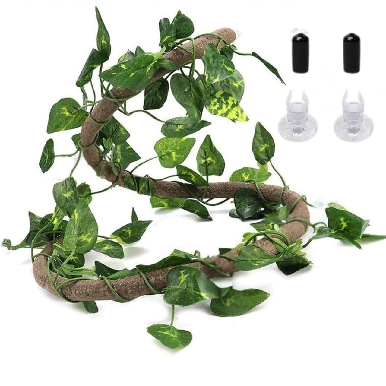 リアルな葉とツタの組み合わせがケージ内を自然環境のように彩り、爬虫類が安心して過ごせる落ち着いた空間を演出します。観賞用としてもインテリア性の高いデザインです。