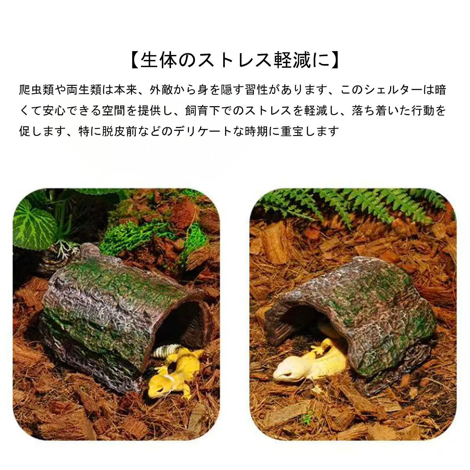 【生体のストレス軽減に】 爬虫類や両生類は本来、外敵から身を隠す習性があります。このシェルターは暗くて安心できる空間を提供し、飼育下でのストレスを軽減し、落ち着いた行動を促します。特に脱皮前などのデリケートな時期に重宝します。