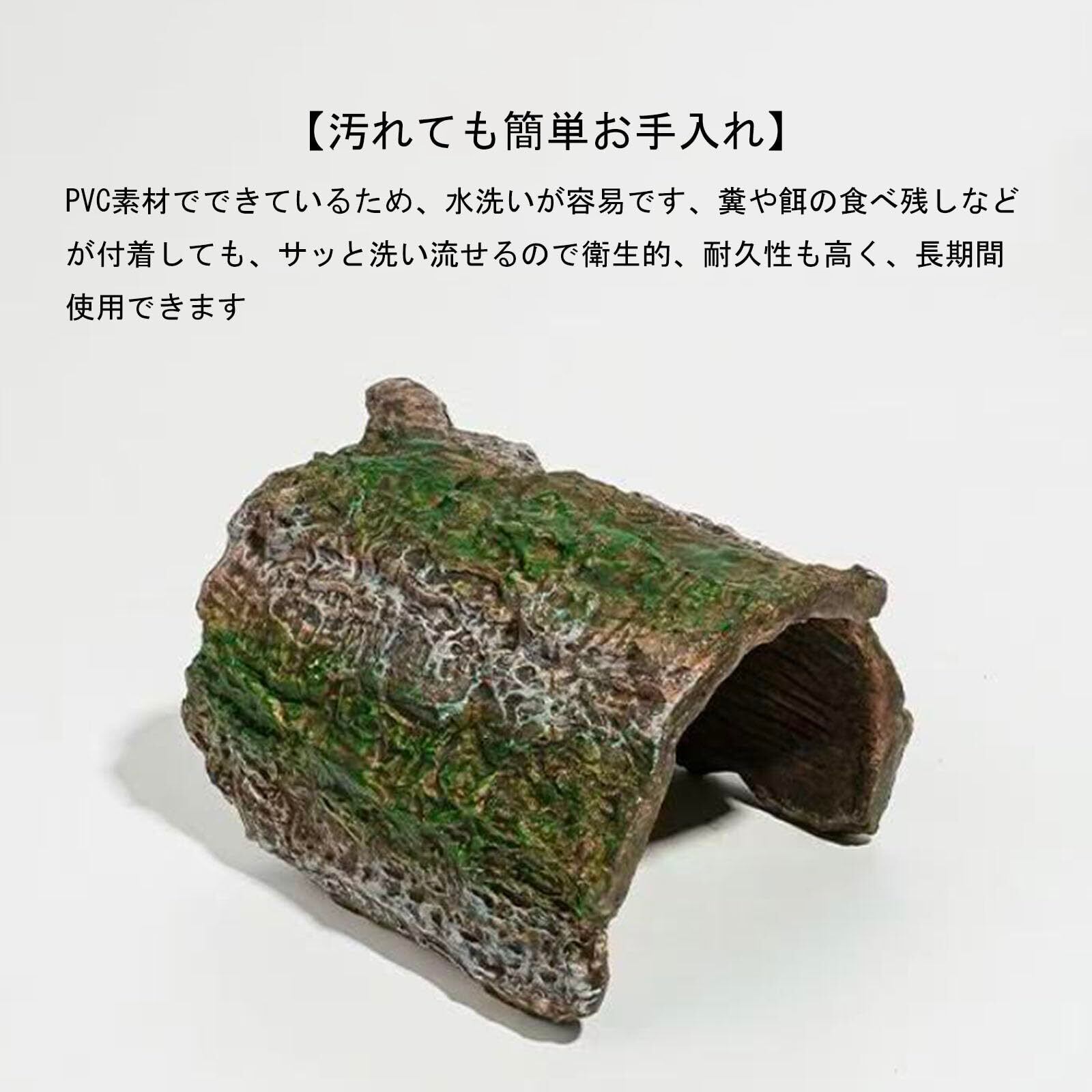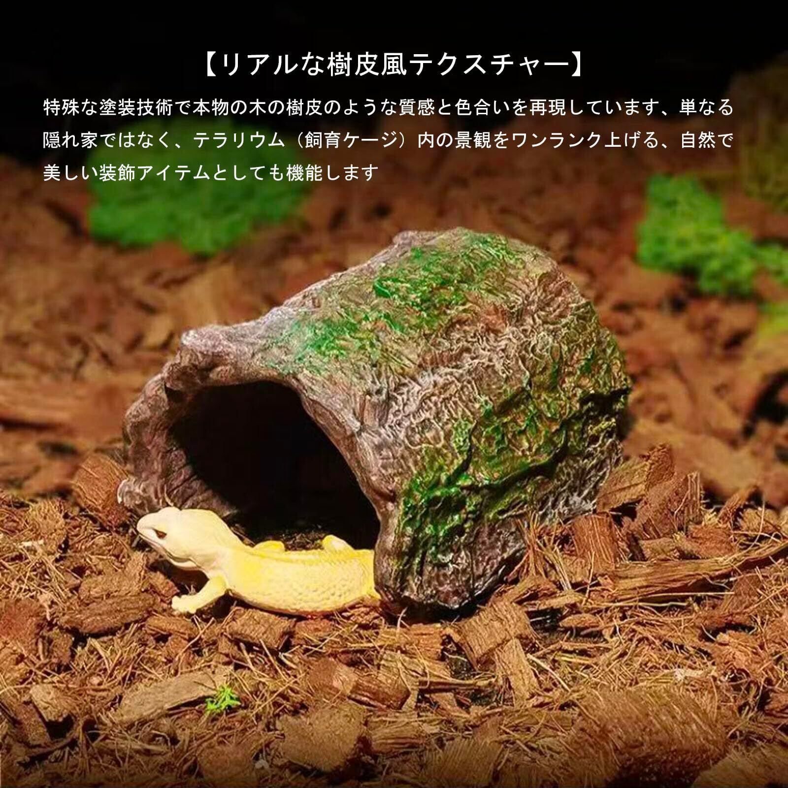 【リアルな樹皮風テクスチャー】 特殊な塗装技術で本物の木の樹皮のような質感と色合いを再現しています。単なる隠れ家ではなく、テラリウム(飼育ケージ)内の景観をワンランク上げる、自然で美しい装飾アイテムとしても機能します。