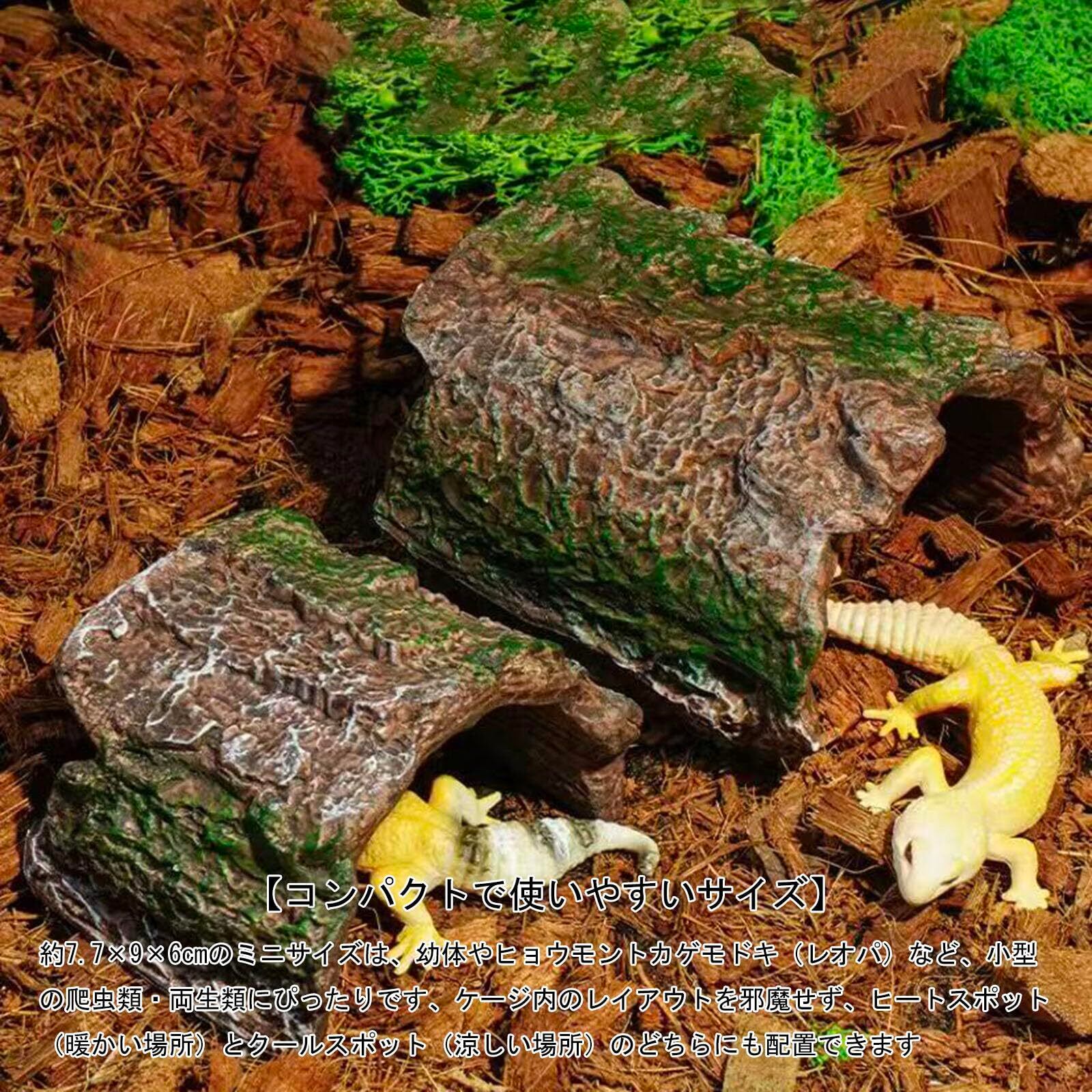 【コンパクトで使いやすいサイズ】 約7.7×9×6cmのミニサイズは、幼体やヒョウモントカゲモドキ(レオパ)など、小型の爬虫類・両生類にぴったりです。ケージ内のレイアウトを邪魔せず、ヒートスポット(暖かい場所)とクールスポット(涼しい場所)のどちらにも配置できます。