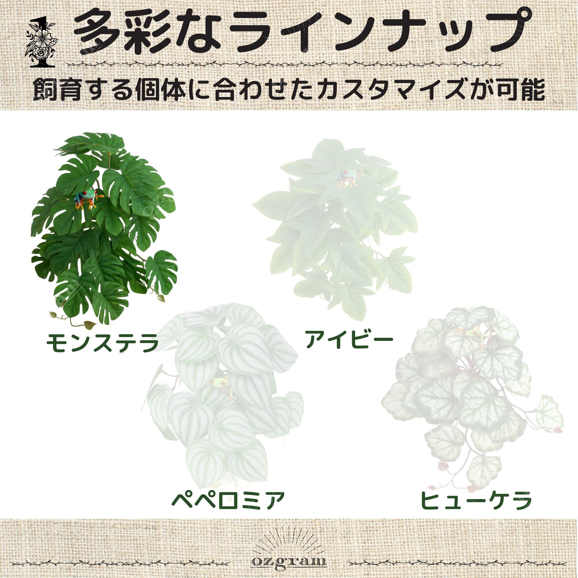 【多彩なラインナップ】 アイビー、モンステラ、ペペロミア、ヒューケラの4種類からお選び頂けます。水槽の雰囲気や飼育する個体に合わせたカスタマイズが可能です。