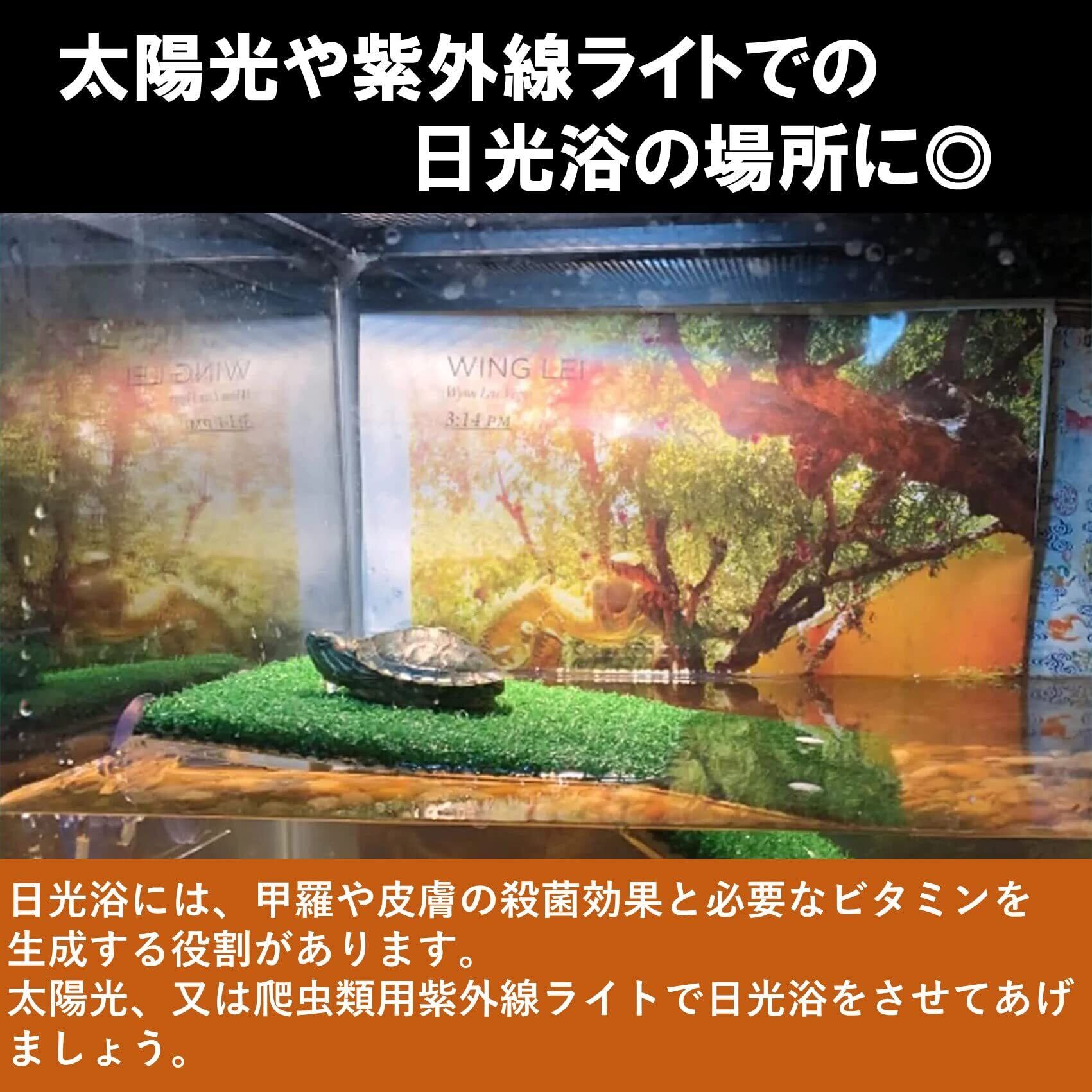 亀などの爬虫類や両生類が日光を浴びて休息するのに適した浮き島プラットホームです。日光浴には、甲羅や皮膚の殺菌効果と必要なビタミンを生成する役割があります。太陽光、又は爬虫類用紫外線ライトで日光浴をさせてあげましょう。
