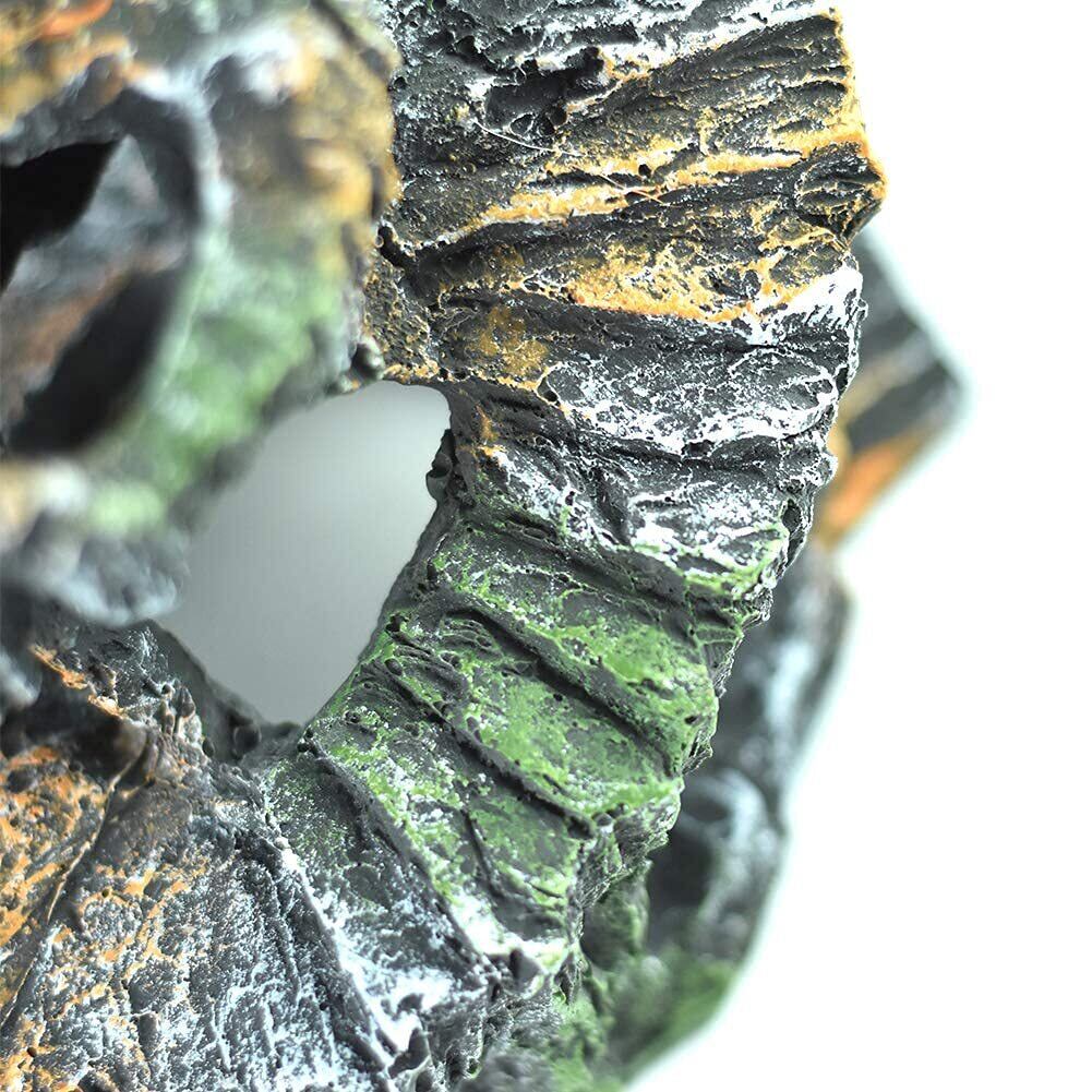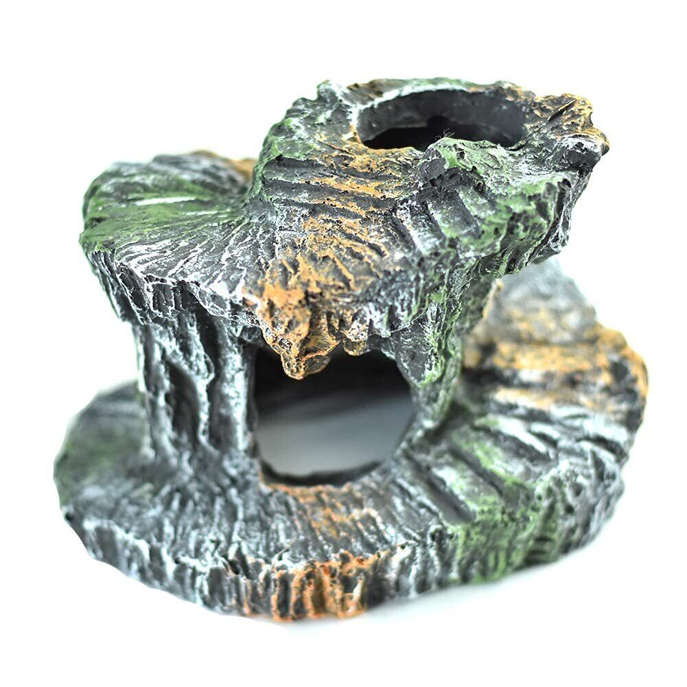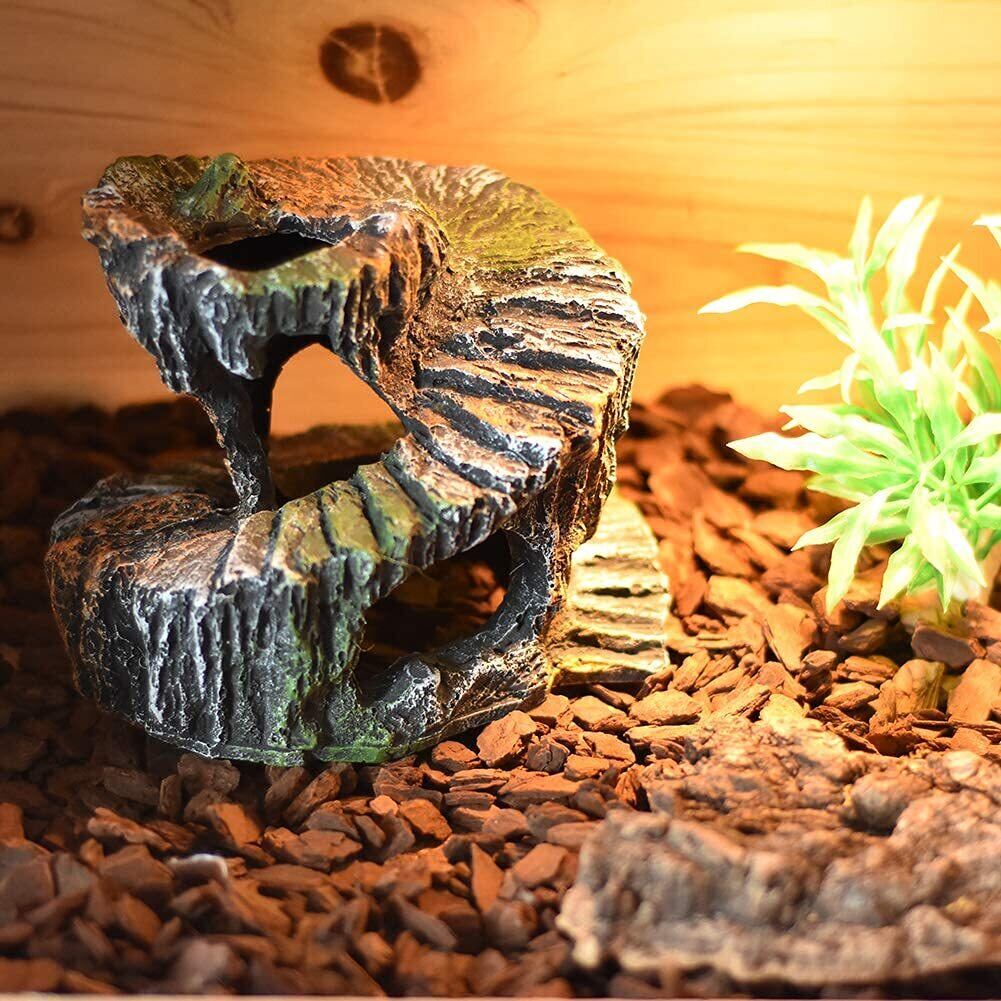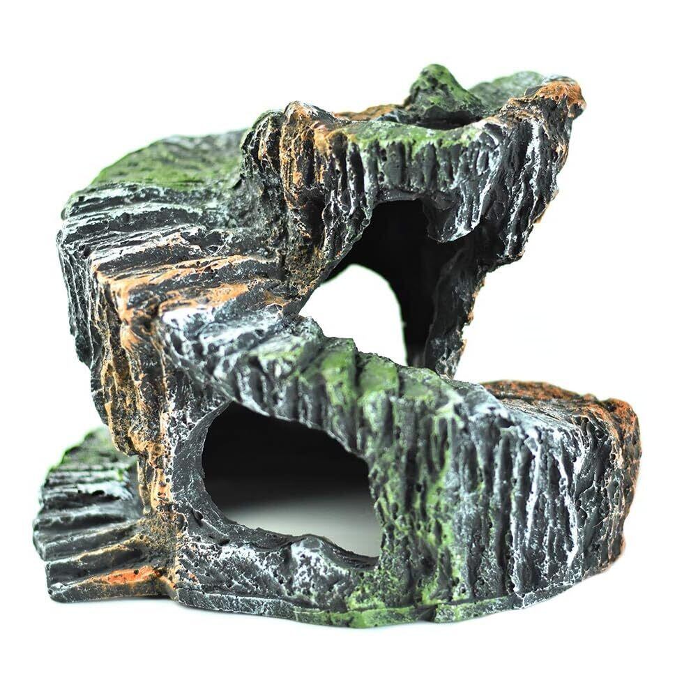 この洞窟型デザインの爬虫類シェルターは、爬虫類や両生類のための理想的な隠れ家です。約14.5cm x 11.4cmのサイズで、複数の開口部を持つ独特な回転形状により、ペットが自由に出入りできる快適な空間を提供します。リアルな岩肌のテクスチャーと緑の苔の装飾が、自然な生息環境の雰囲気を演出します。亀、トカゲなどの爬虫類に最適な隠れ家として、ペットに安全な休息場所を提供します。複数の開口部により、ペットは自由に移動でき、ストレスなく生活できます。水槽やテラリウムの装飾としても魅力的で、生体の行動範囲を広げながら、見た目にも美しい環境を作り出します。耐久性のある素材で作られており、水中でも安定して使用できます。