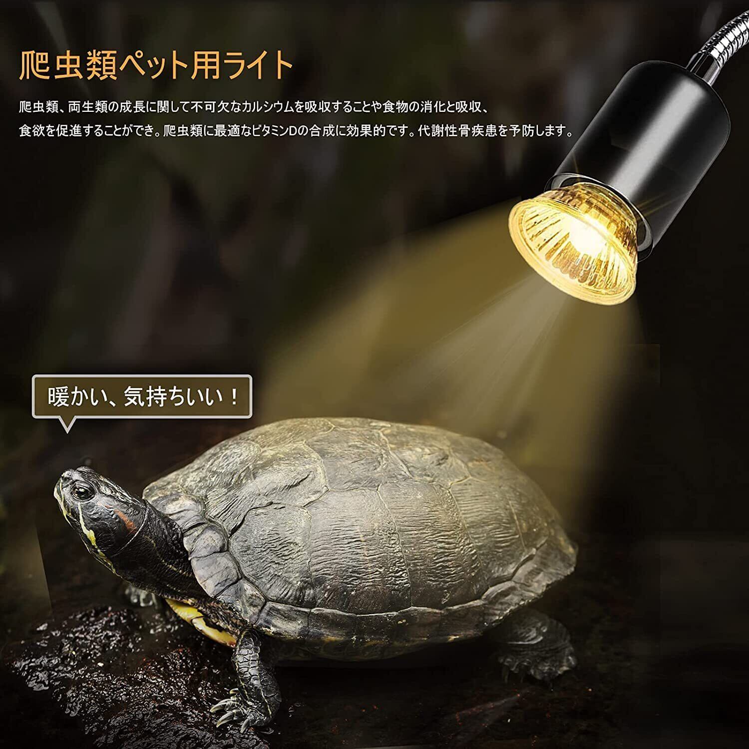 【爬虫類 ペットに最適な紫外線 ライト】:紫外線ライトは爬虫類の健康管理に欠かせないアイテムです。トカゲやカメなどの爬虫類を飼育する際には多くの場合、健康を維持するために紫外線ライトが必要です。爬虫類に良い保健作用があります、ウミガメなどのカルシウムの吸収に 役立つ、代謝性骨病を防止あるいは逆転できます、この爬虫類ライトは初心者としては扱いやすくで室内飼育の亀の為 には必須アイテムです。自然な砂漠の環境に似ている高いUVB出力。色温度が純正で、集光効果もよくて、視認性が最高です。120°の視点で多くの光が爬虫類に吸収され、エネルギーを節約します。