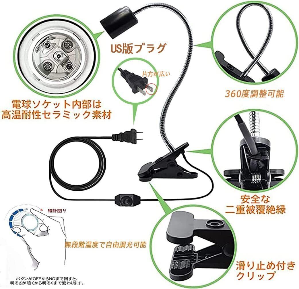 【角度調節・回転可能な設計】: 360°回転可能なクリップライト、好きな角度に曲げることができます、 簡単な取り付けと実用性がある。クリップで固定できますが、亀用に水槽の外側上部からに楽に使用できます。末端はゴムが付いているクッリプで、飼育ケースに挟んだり、壁にかけたりして、好きな角度、使い心地のいいところから日光浴させましょう。注意:電源ブラグはアメリカタイプ、使用できない場合交換アダアダが必要