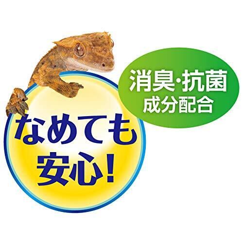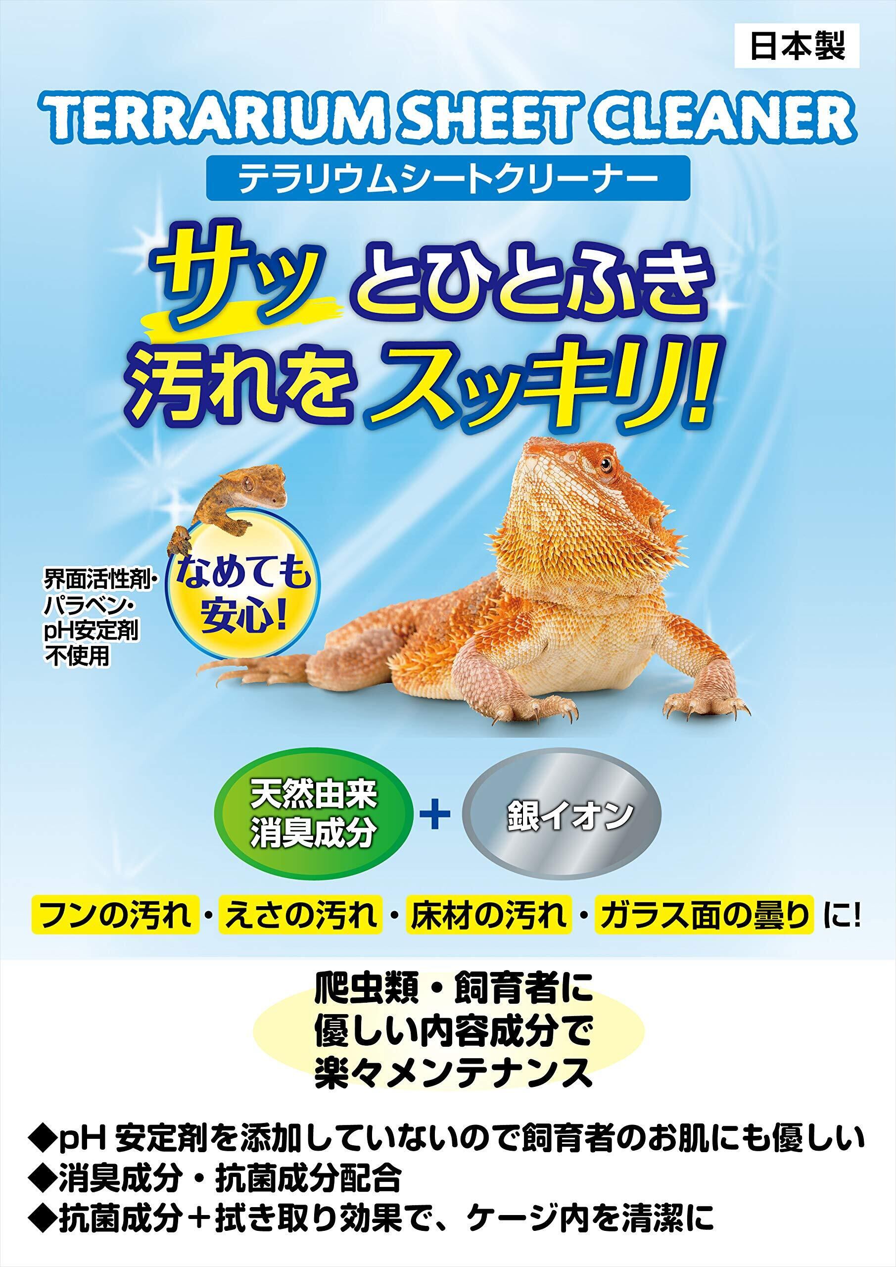 サッとひとふき!汚れをスッキリ!なめても安心の爬虫類・両生類のケージ・用品のお掃除シート フンの汚れ・えさの汚れ・床材の汚れ・ガラス面の曇りに! ●爬虫類・両生類飼育用品専用のお掃除ウェットシート。毎日のお世話のついでにサッと掃除して、キレイをキープ。 ●pH安定剤不使用なので、肌への刺激が少ないため生体に触れても安心。 ●柿の実から抽出した天然由来消臭成分に、抗菌効果のある銀イオンをプラス。 爬虫類・両生類・昆虫 実使用試験済み※全ての生体に影響が無いことをするわけではありません。 ●なめても安心! 界面活性剤/パラベン/pH安定剤不使用 ●消臭・抗菌成分配合 ●無香料 ●日本製 <ご使用方法>●;表面の開封シールをめくり、1枚ずつ取り出してご使用ください。●ケージやオーナメント、ピンセット、えさ皿等の汚れを拭きとってください。※使用後は乾燥を防ぐため、開封シールをきちんと閉めてください。 内容量: 40枚入 サイズ:約15×20cm(1枚当たり)