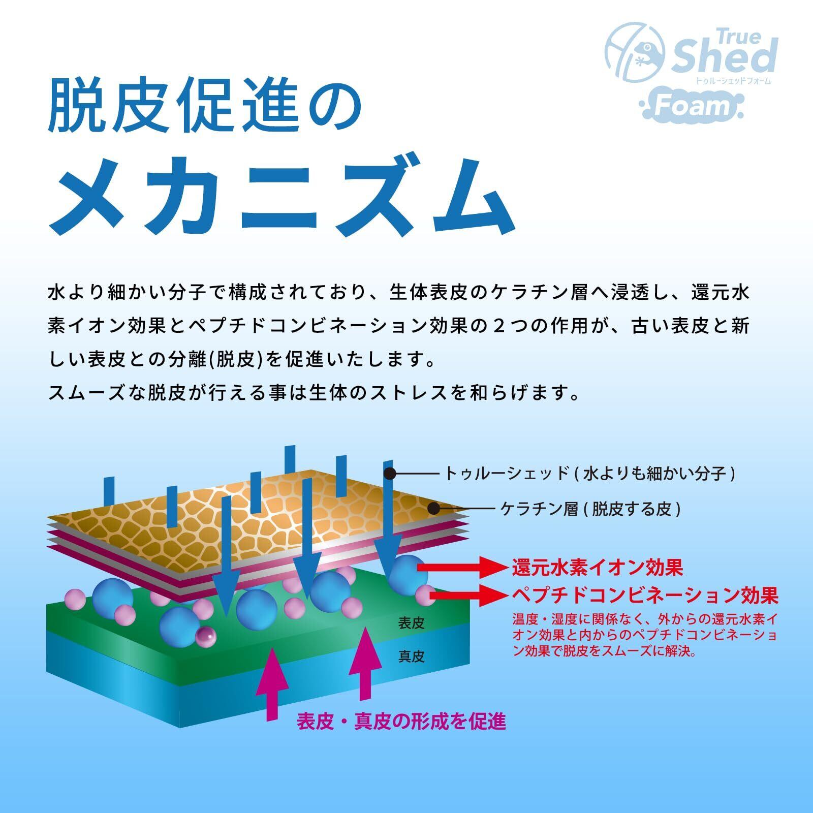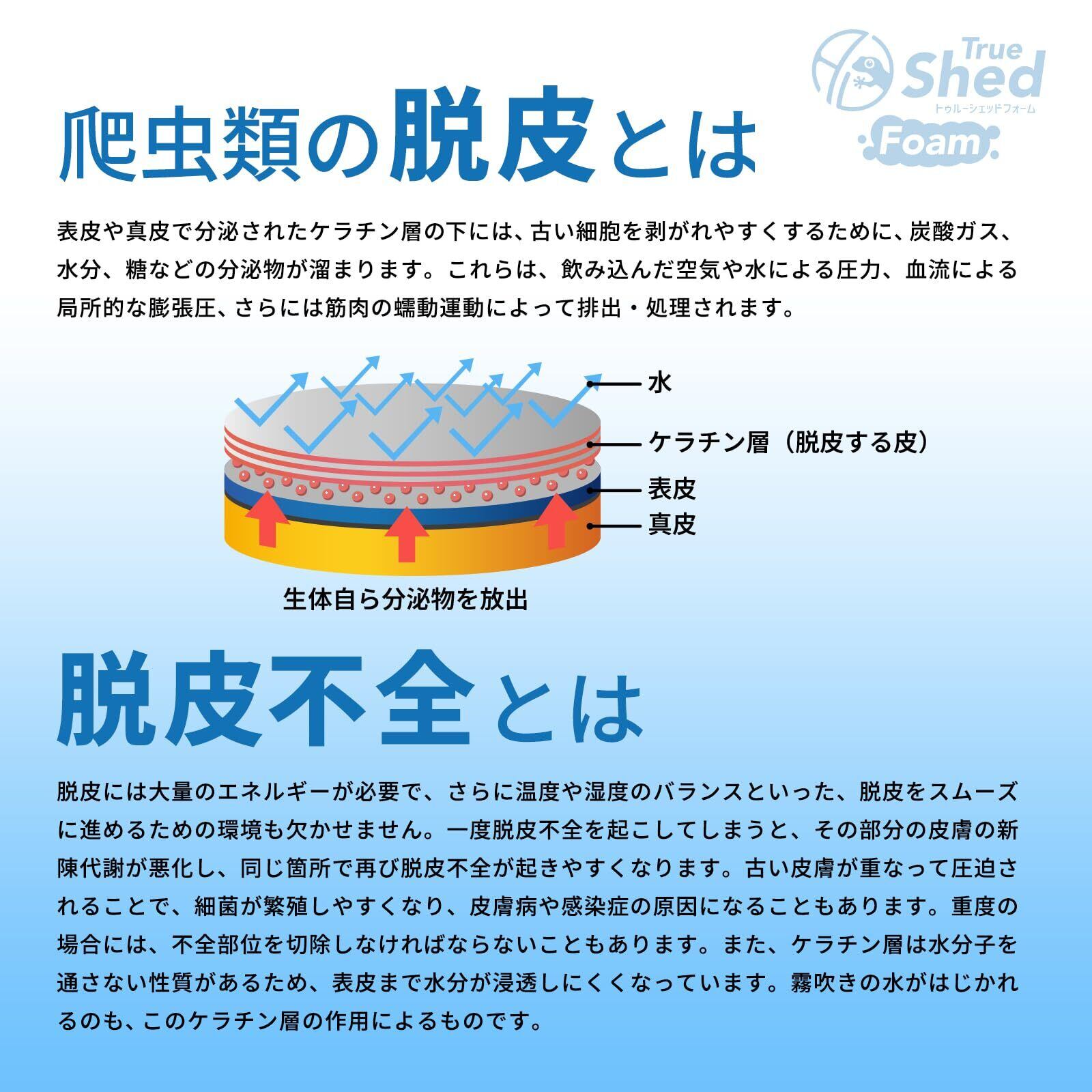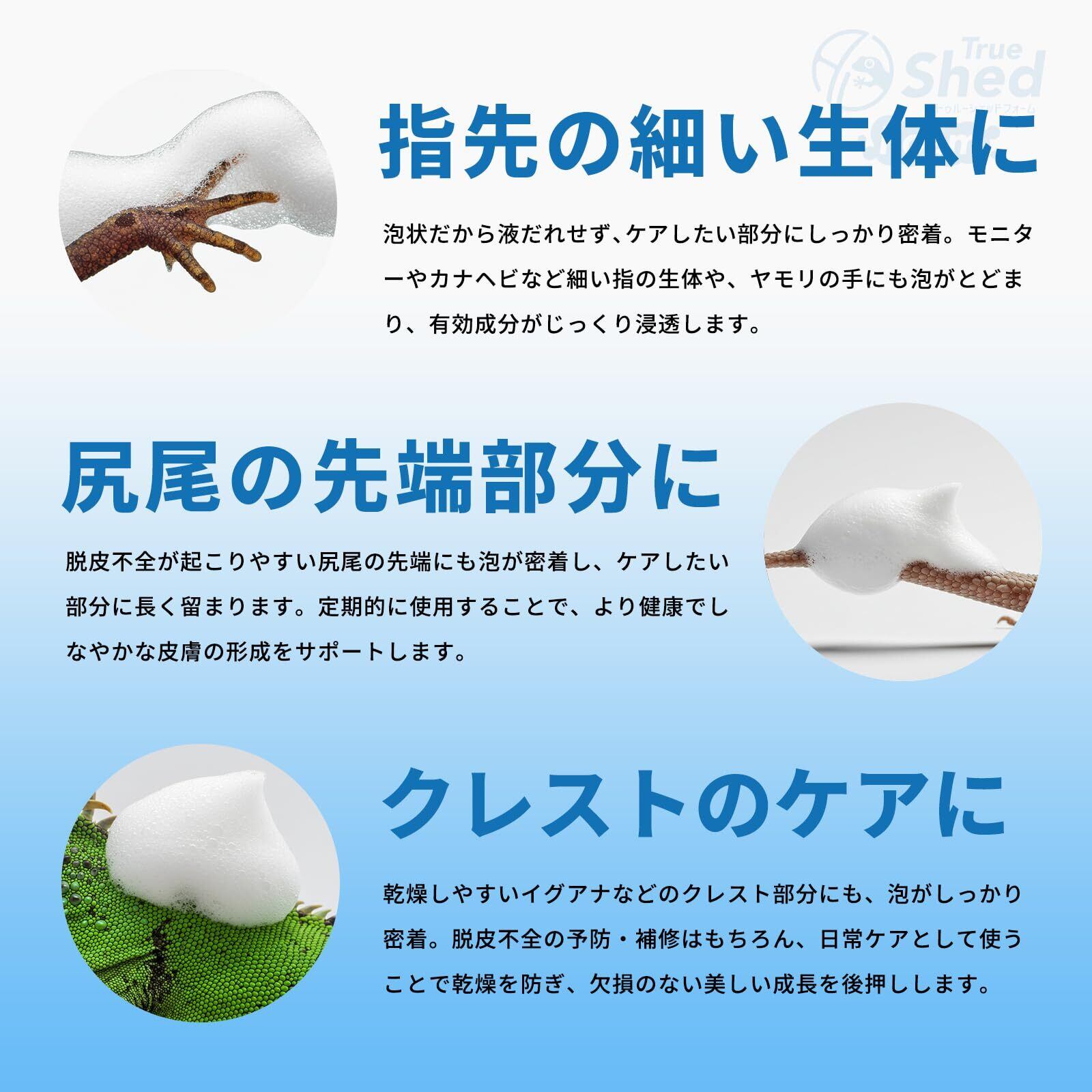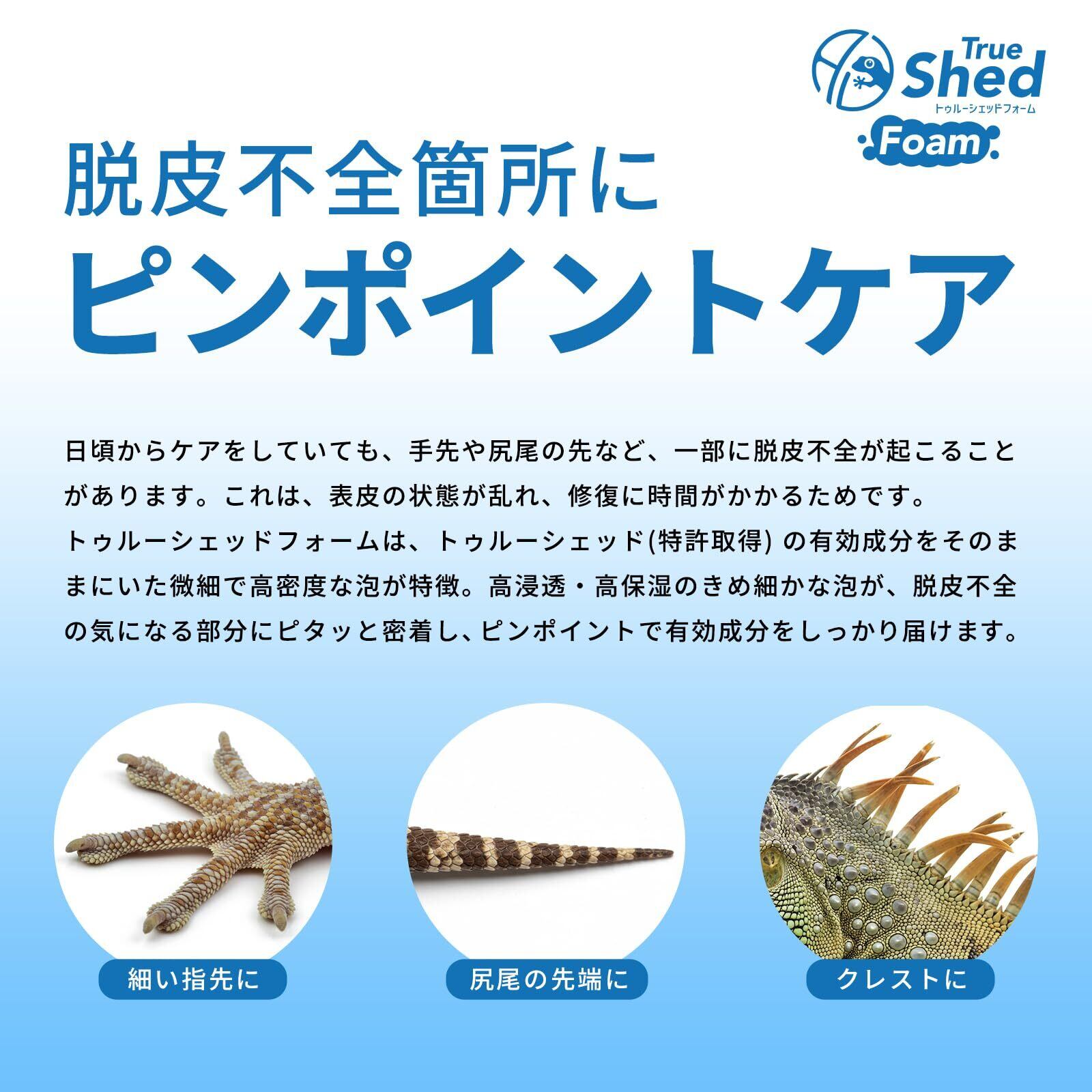 部分的な脱皮不全に。密着泡で集中ケア「トゥルーシェッドフォーム」 どんなに気をつけていても、手先やしっぽの先などに部分的な脱皮不全が起こることはあります。これは、表皮の状態が乱れて修復に時間がかかってしまうためです。 「トゥルーシェッドフォーム」は、通常のトゥルーシェッドの効果はそのままに、泡タイプにすることで、より高い浸透力と保湿力を実現しました。きめ細やかな泡が脱皮不全の気になる部分にぴたっと密着し、液だれせずに成分をしっかり届けます。 泡が長時間留まることで、集中ケアが可能に。定期的に使用することで新陳代謝が活性化され、健康な皮膚組織の形成をサポートします。 指が細い小型の生体にも使いやすく、ピンポイントのケアに最適です。 ※ご使用の際は、よく振ってからお使いください。