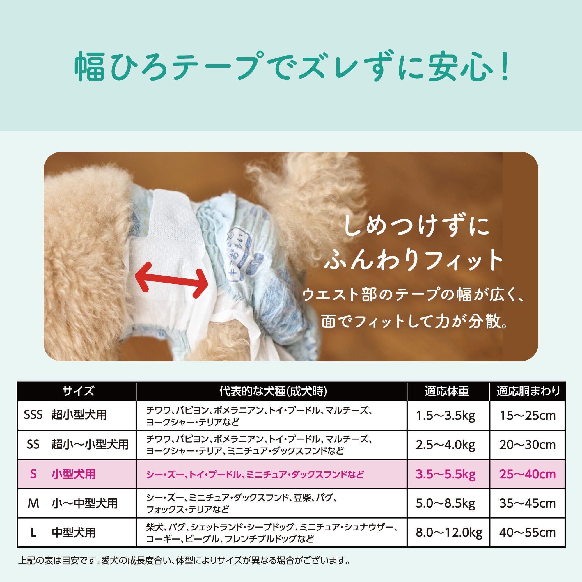 室内向けテープタイプの犬用紙おむつ。ベッドやソファーの上で一緒に過ごすとき、ワンちゃんも快適でリラックス。●ずれずに安心、幅ひろテープでしっかりとまる。ウエスト部のテープの幅が広く、面でフィットして力が分散しゆったり装着できてワンちゃんにやさしい。●ムレ0発想でさらさら感がつづいてお肌にやさしい。スピード吸収体と全面通気性シートでムレにくい。おしっこした厚に急激に高まる湿度を素早く外に逃がすことでムレの原因を減らします。●男の子も女の子も安心のフロントポケット構造。男の子の性器もしっかりおさまる。お腹まわりからのモレをブロック。男の子、女の子共用。【使用シーン】・一緒のベッドでの就寝・お留守番・ソファーの上でリラックス
