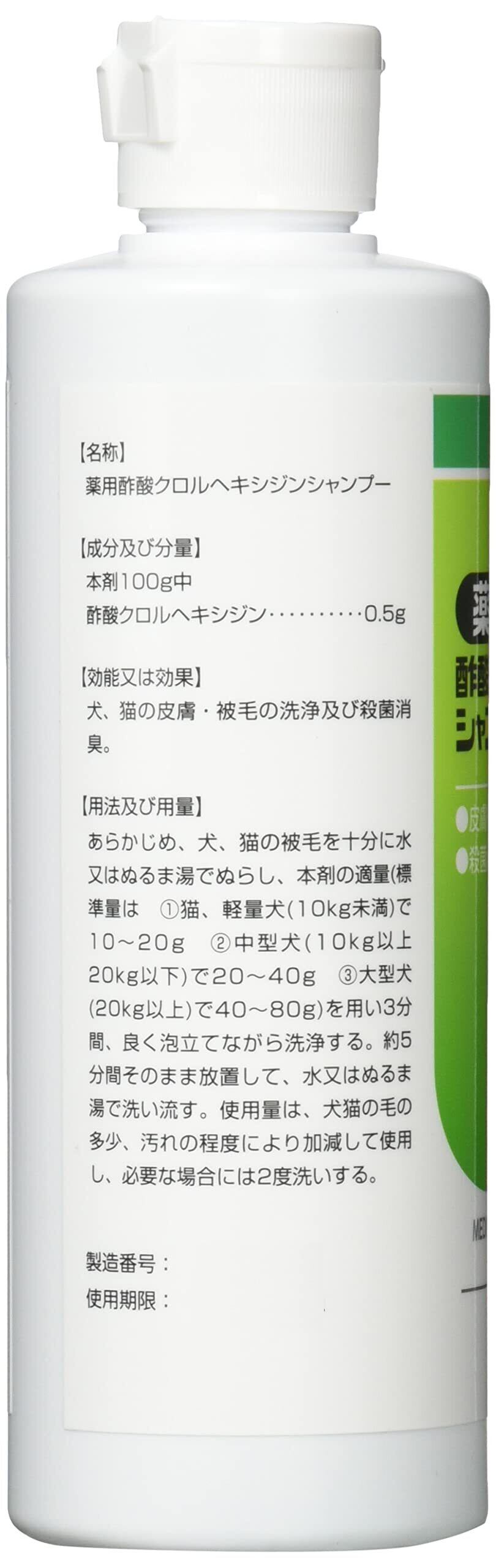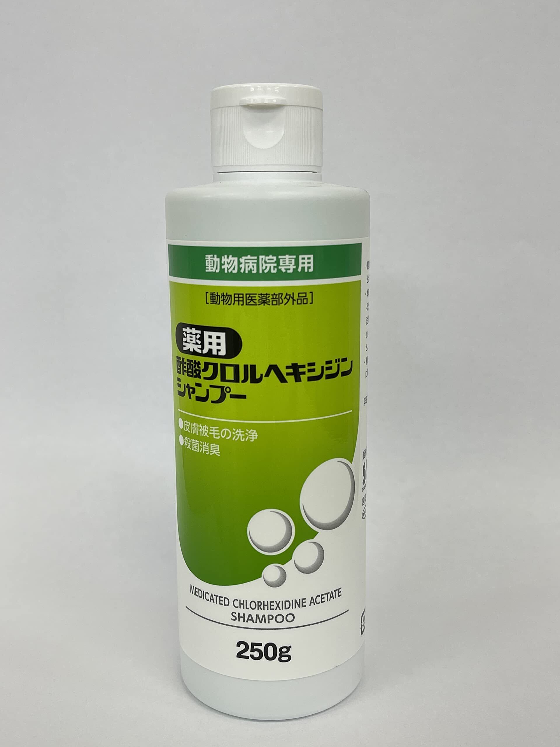 薬用酢酸クロルヘキシジンシャンプーは、皮膚・被毛の洗浄や殺菌消臭に効果のある犬猫兼用のシャンプーです。 動物病院で最も処方されているクロルヘキシジン配合で、その用途は幅広く使用されております。 クロルヘキシジンはフェノール系の消毒剤で、細菌・真菌・ウィルスなど広い抗菌作用を持っています。 毒性や刺激性が共に低く、低濃度でも殺菌効果があり、一般細菌には通常濃度0.5%で使用されています。 また安全性が高く、長時間有効性を保つことができます。