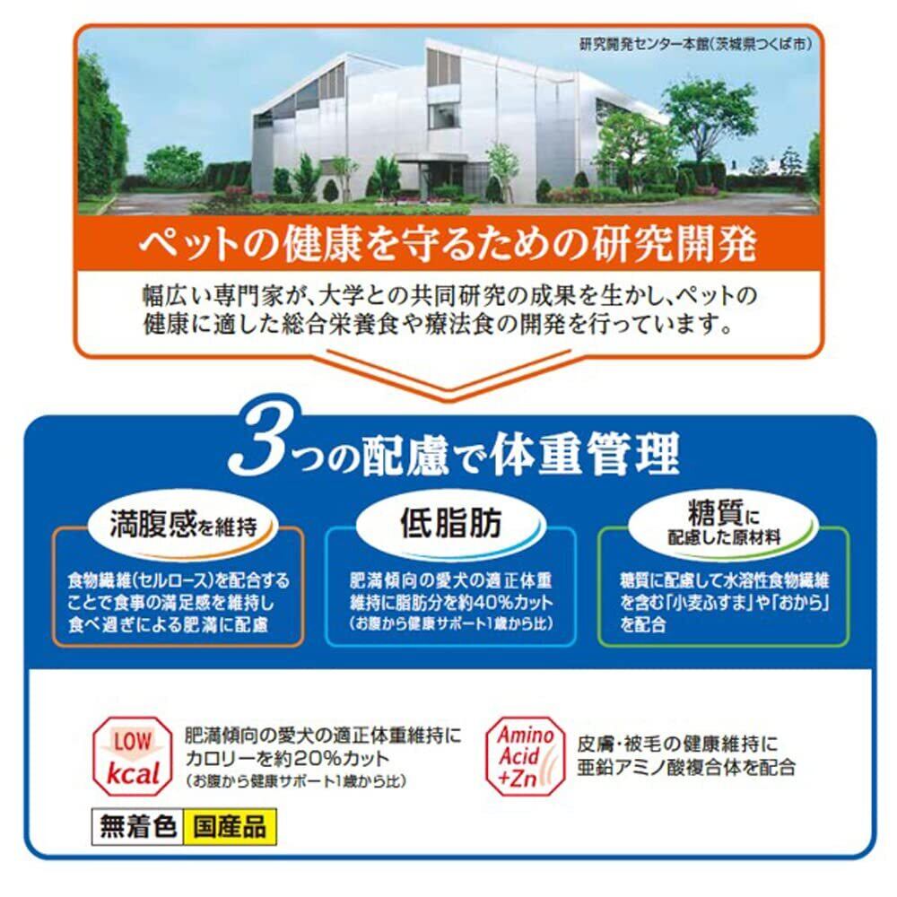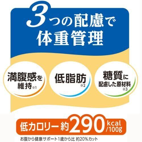 食欲旺盛で、肥満気味の愛犬の健康に配慮した栄養設計。さらに豊富な食物繊維により満腹感をアップ。低カロリーに加え、「満腹感を維持」「GI値に配慮」「低脂肪」の3つの配慮で健康な体重管理をサポートします。