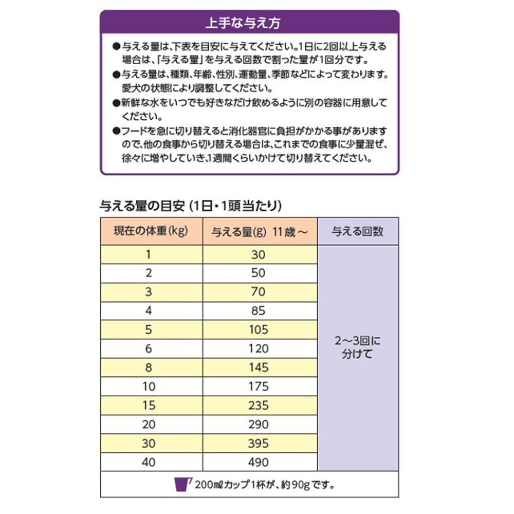 原材料:穀類(小麦全粒粉、小麦粉、米粉、小麦ふすま、米ぬか)、豆類(脱脂大豆、おから)、肉類(ミートミール、チキンミール、チキンレバーパウダー)、油脂類(動物性油脂:ビーフオイル、フィッシュオイル:DHA・EPA源)、ビートパルプ、糖類(フラクトオリゴ糖)、β-グルカン、セレン酵母、乳酸菌、ビタミン類(A、D3、E、K3、B1、B2、パントテン酸、ナイアシン、B6、葉酸、ビオチン、B12、C、コリン)、ミネラル類(カルシウム、ナトリウム、塩素、鉄、コバルト、銅、マンガン、亜鉛アミノ酸複合体、亜鉛、ヨウ素)、アミノ酸類(メチオニン)、酸化防止剤(ローズマリー抽出物、ミックストコフェロール)