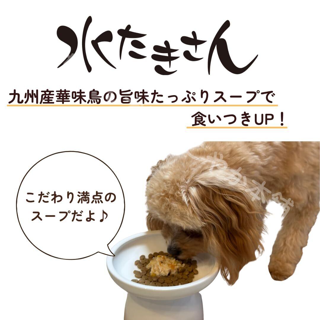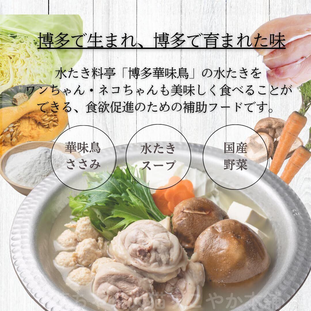 【犬猫兼用の水たき風おやつ】 華味鳥を使った自慢の博多風水たき、余計なものは一切入れない無添加仕上げ。 ワンちゃんネコちゃんも一緒楽しめます