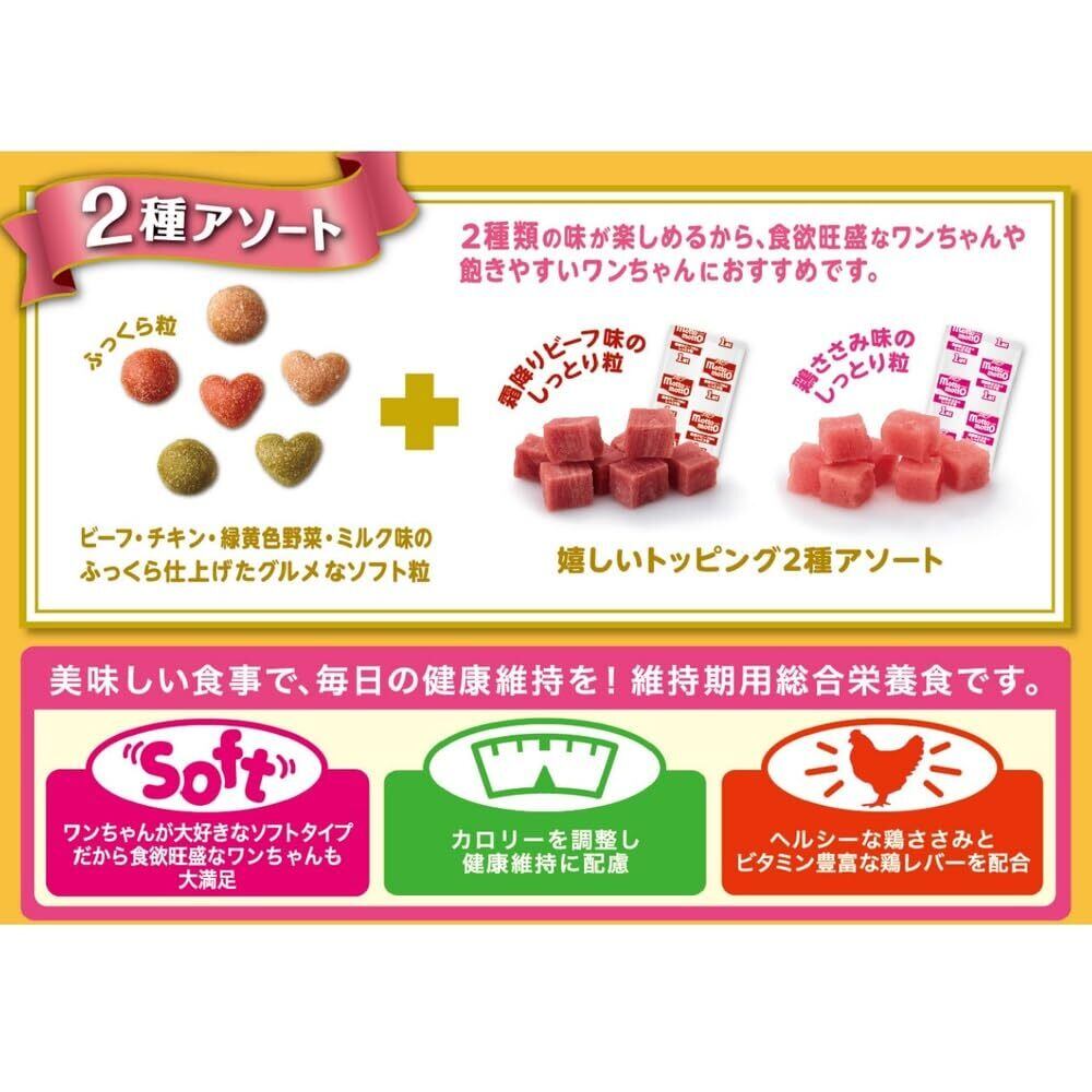 ワンちゃんに人気のトッピングが2種類入ったアソートタイプ。口の小さいワンちゃんに食べやすい小粒タイプ。ソフトタイプのふっくら粒。小分け8パック+脱酸素剤入りで作りたてのおいしさキープ。