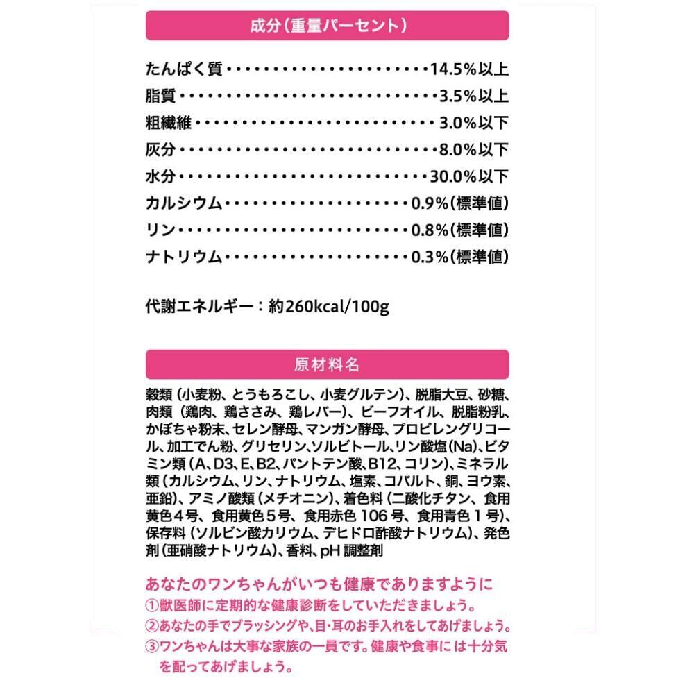 穀類(小麦粉、とうもろこし、小麦グルテン)、脱脂大豆、砂糖、肉類(鶏肉、鶏ささみ、鶏レバー)、ビーフオイル、脱脂粉乳、かぼちゃ粉末、酵母、プロピレングリコール、ミネラル類(カルシウム、リン、ナトリウム、塩素、銅、亜鉛、ヨウ素、コバルト)、ソルビトール、加工でんぷん、pH調整剤、グリセリン、保存料(ソルビン酸カリウム、デヒドロ酢酸ナトリウム)、リン酸塩(Na)、ビタミン類(A、D、E、B2、B12、パントテン酸、コリン)、香料、着色料(二酸化チタン、食用黄色4号、食用黄色5号、食用赤色106号、食用青色1号)、発色剤(亜硝酸ナトリウム)