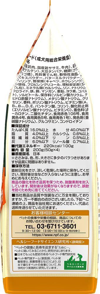 肉類(国産鶏肉、国産鶏ササミ、牛肉)、穀類(小麦粉、小麦グルテン)、大豆タンパク、糖類(グラニュー糖、オリゴ糖)、馬鈴薯でん粉、動物性油脂、フィッシュエキスパウダー、バターミルクパウダー、チーズフィリング、野菜類(キャベツ、ホウレンソウ)、セレン酵母、プロピレングリコール、増粘安定剤(加工でん粉)、ミネラル類(カルシウム、リン、ナトリウム、クロライド、鉄、銅、マンガン、亜鉛、ヨウ素、コバルト)、ソルビトール、保存料(ソルビン酸カリウム、デヒドロ酢酸ナトリウム)、メタリン酸ナトリウム、グリセリン、香料、ポリリン酸ナトリウム、ビタミン類(A、B2、B12、D、E、パントテン酸、コリン)、酸化防止剤(エリソルビン酸ナトリウム、ビタミンC)、着色料(β-カロテン、二酸化チタン、食用赤色106号、食用黄色4号、食用黄色5号、食用青色1号)、発色剤(亜硝酸ナトリウム)、グルコサミン、コンドロイチン