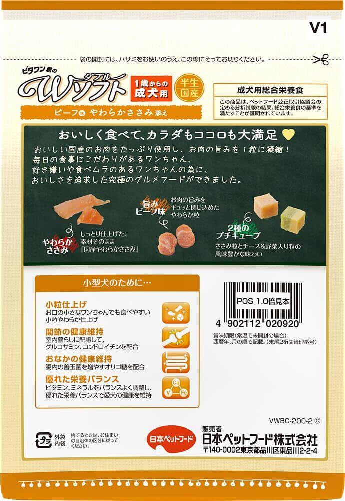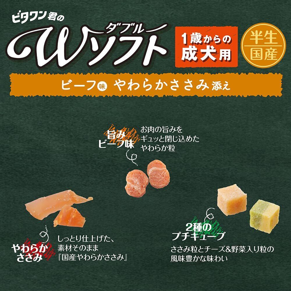ビタワン君のWソフト 成犬用 【半生タイプ】 【たっぷりお肉】 【国産】 【小分包装】 ドッグフード お肉を味わうビーフ味粒・やわらかささみ 犬 200g