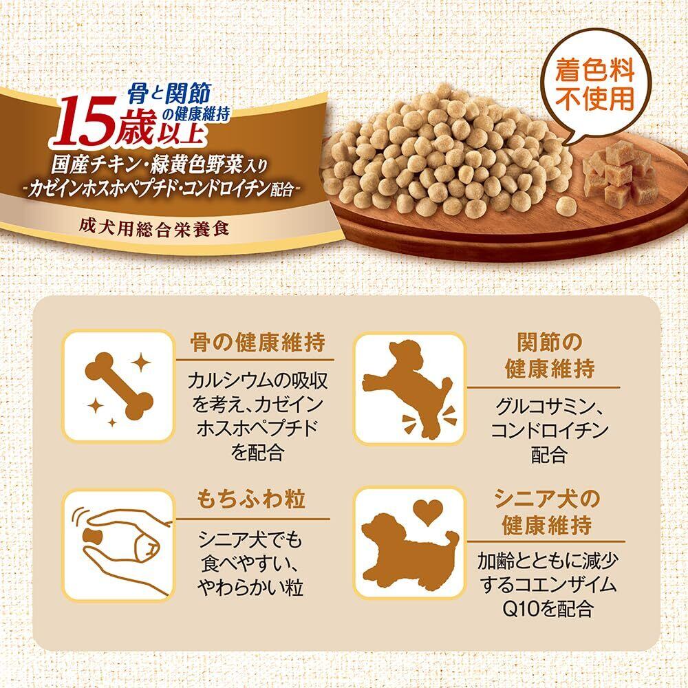着色料不使用。国産鶏肉を使用し、やわらかささみ粒をトッピング。骨と関節の健康を維持。15歳以上。