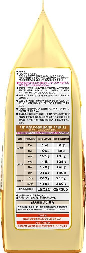1日1頭当たりの食事量の目安 1歳以上このフードと水だけを与える場合 食事量は目安です。ペットの体重や体型を見ながら量を調整してください。 活発に動く犬超小型犬 体重2kg75g 体重3kg100g小型犬 体重4kg125g 体重5kg145g 体重6kg170g 体重8kg210g中型犬 体重10kg245g 体重20kg415g 動きが控えめな犬超小型犬 体重2kg65g 体重3kg85g小型犬 体重4kg105g 体重5kg125g 体重6kg145g 体重8kg180g中型犬 体重10kg215g 体重20kg360g1日の食事回数1から2回日