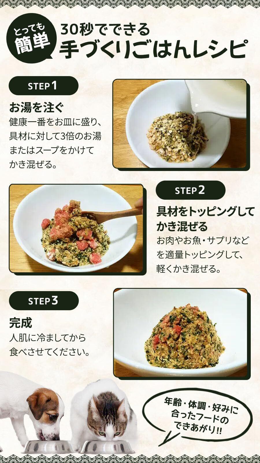 お湯をかけてお肉などのたんぱく質をトッピングするだけ。この全犬種対応の次世代フード「嵐山善兵衛の健康一番」は、アレルギー・皮膚病・ダイエットでお悩みの方、健康な毎日を過ごさせてあげたいという皆様のわが子を思う気持ちを形にしました。食品のプロが健康で美味しいお野菜・穀物をセレクトしブレンド。 全ての食べ物は国産唯一のオーガニックのオートミールをはじめとし全てトレサビリティーのわかる安心で安全なものしか使用しておりません。一切危険な添加物など使用せず、その素材本来の持つ命・素材本来の持つ力を食べて欲しいと思
