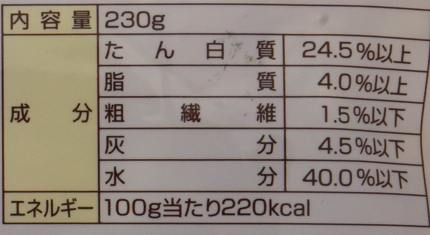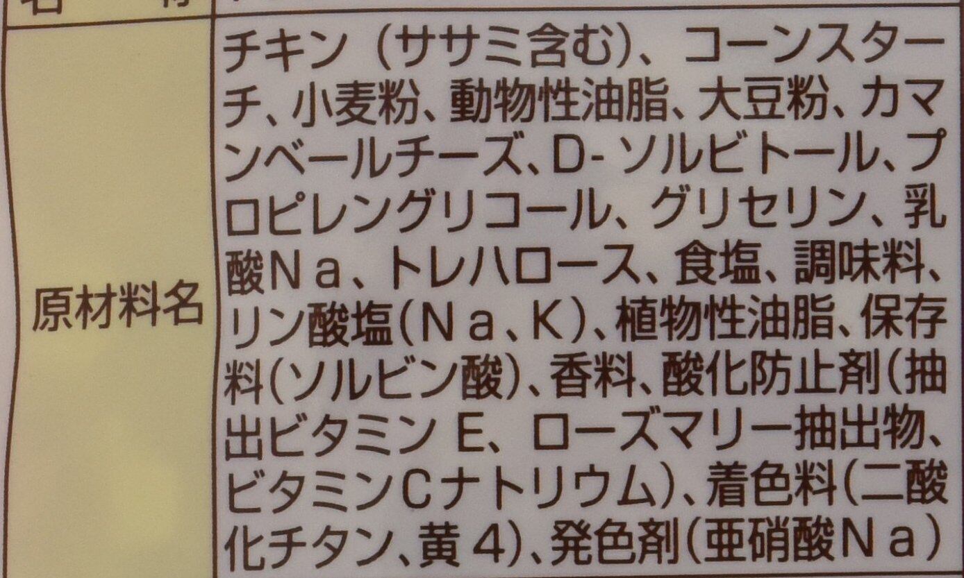 チキン(ささみ含む)、コーンスターチ、小麦粉、動物性油脂、大豆粉、カマンベールチーズ、D-ソルビトール、プロピレングリコール、グリセリン、乳酸Na、リン酸塩(Na、K)、トレハロース、食塩、調味料、植物性油脂、香料、保存料(ソルビン酸)、酸化防止剤(抽出ビタミンE、ローズマリー抽出物、ビタミンCナトリウム)、着色料(二酸化チタン、黄4)