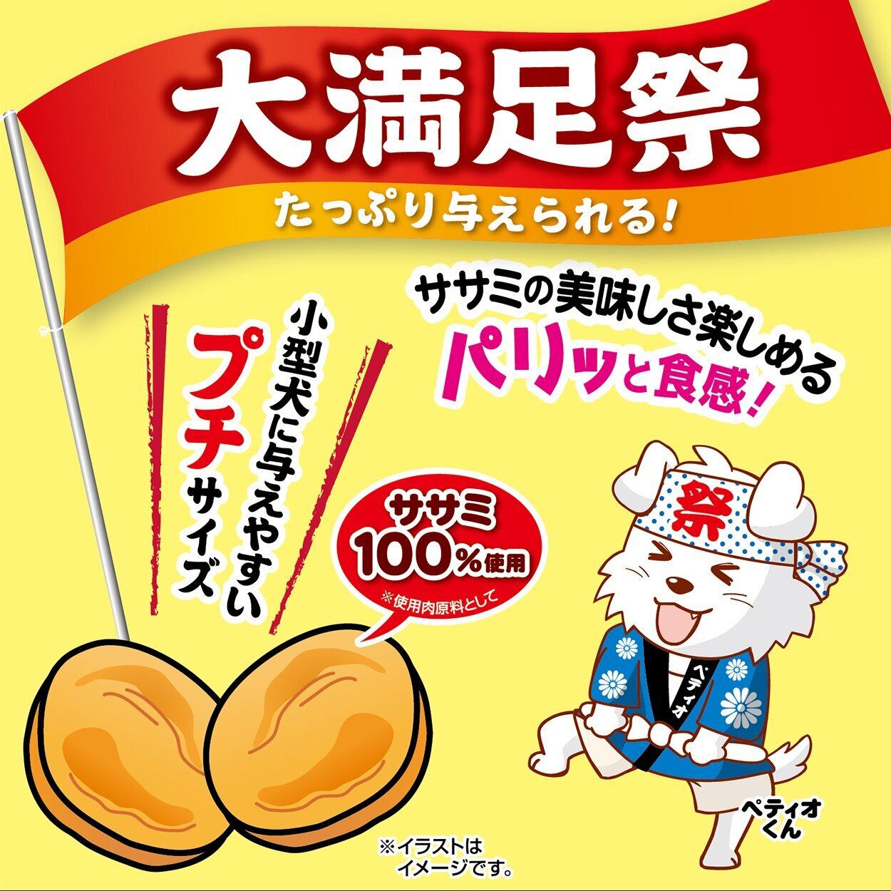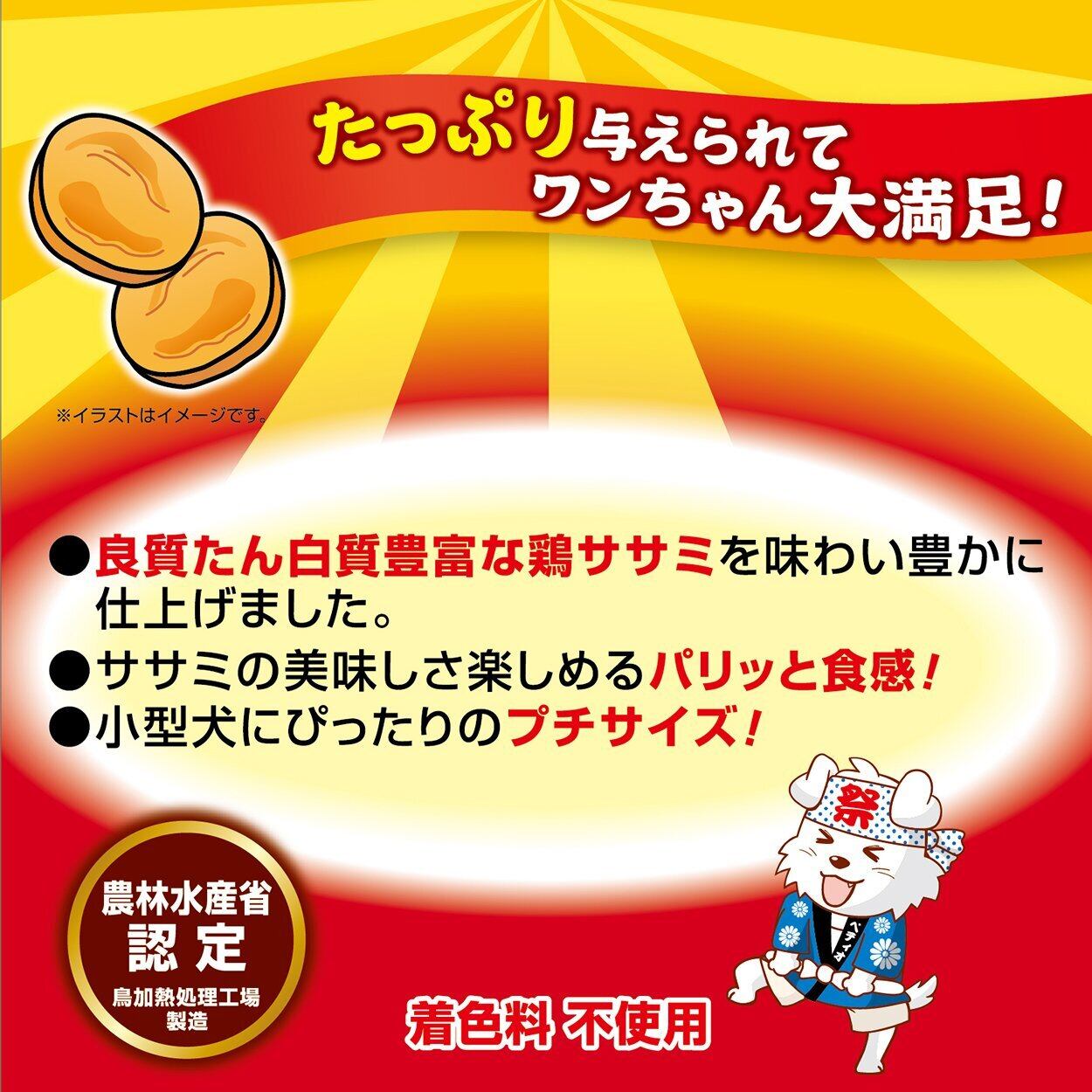 たっぷり与えられてワンちゃん大満足!良質たん白質豊富な鶏ササミを味わい豊かに仕上げました。ササミの美味しさ楽しめるパリッと食感!小型犬にぴったりのプチサイズ!ササミ100%使用(使用肉原料として)農林水産省認定 鳥加熱処理工場製造。着色料不使用。