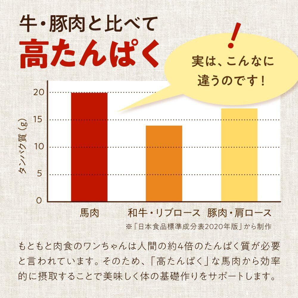 #4 \体にやさしい馬肉!/ 一般のおやつに使用されている豚肉や牛肉などと比べて、馬肉は低脂質、高タンパク!たっぷりの鉄分、たんぱく質とEPAなどの栄養素で体をサポート!しかも!馬肉は低アレルゲン食材と言われているため、アレルギーをお持ちのワンちゃんも是非お試しください!