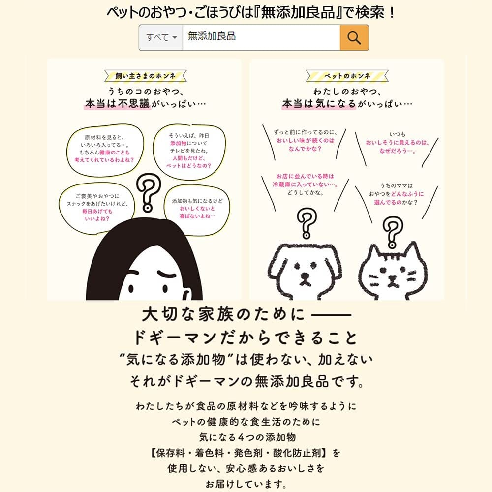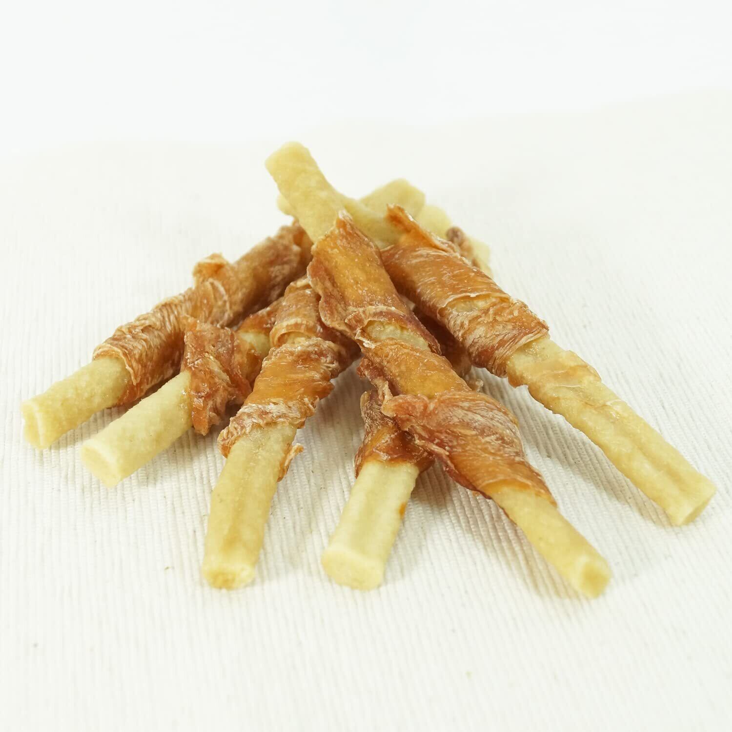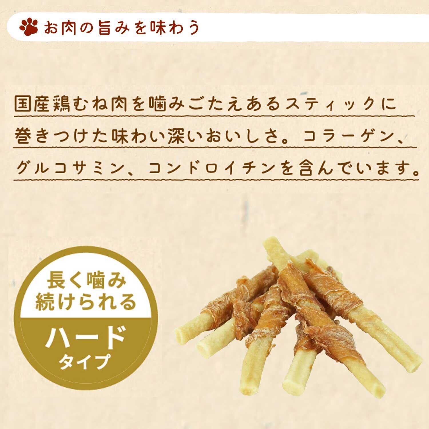 ・保存料、着色料、発色剤、酸化防止剤を使わずに作りました。・魚と鶏の軟骨が入った噛みごたえあるスティックに、白いむね肉を巻きつけました。・軟骨形成成分が、関節の健康を維持します。