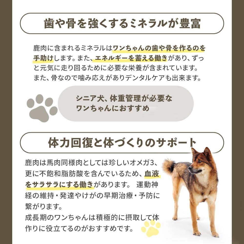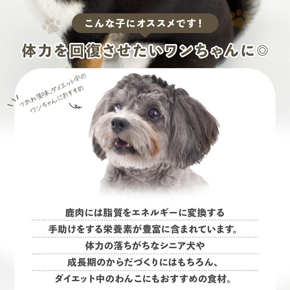 鹿肉は嗜好性が高い鹿肉はほかの牛や豚とも違う独特な香りで、ペットの野生心を刺激します。皮膚疾患持ち、室内飼いのワンちゃん-皮膚を保護する役割があります- 鹿肉にはビタミンB2が含まれており、皮膚と被毛の健康維持、質を向上させるための重要な栄養の一つです。 不足してしまうと、皮膚や被毛が乾燥し病気を引き起こしてしまう可能性があります。 室内犬、皮膚が弱いワンちゃんには意識的に摂取することがおすすめ