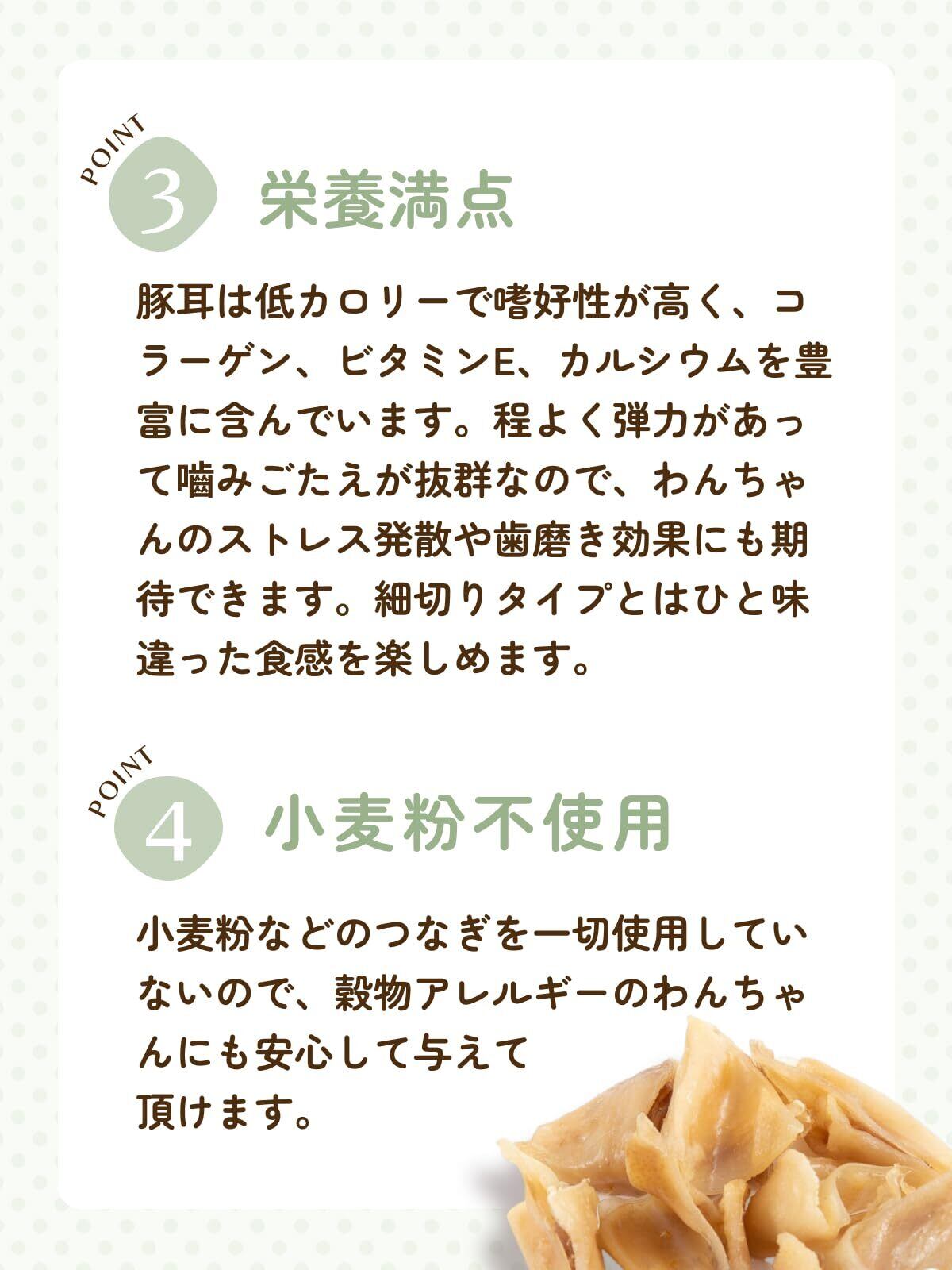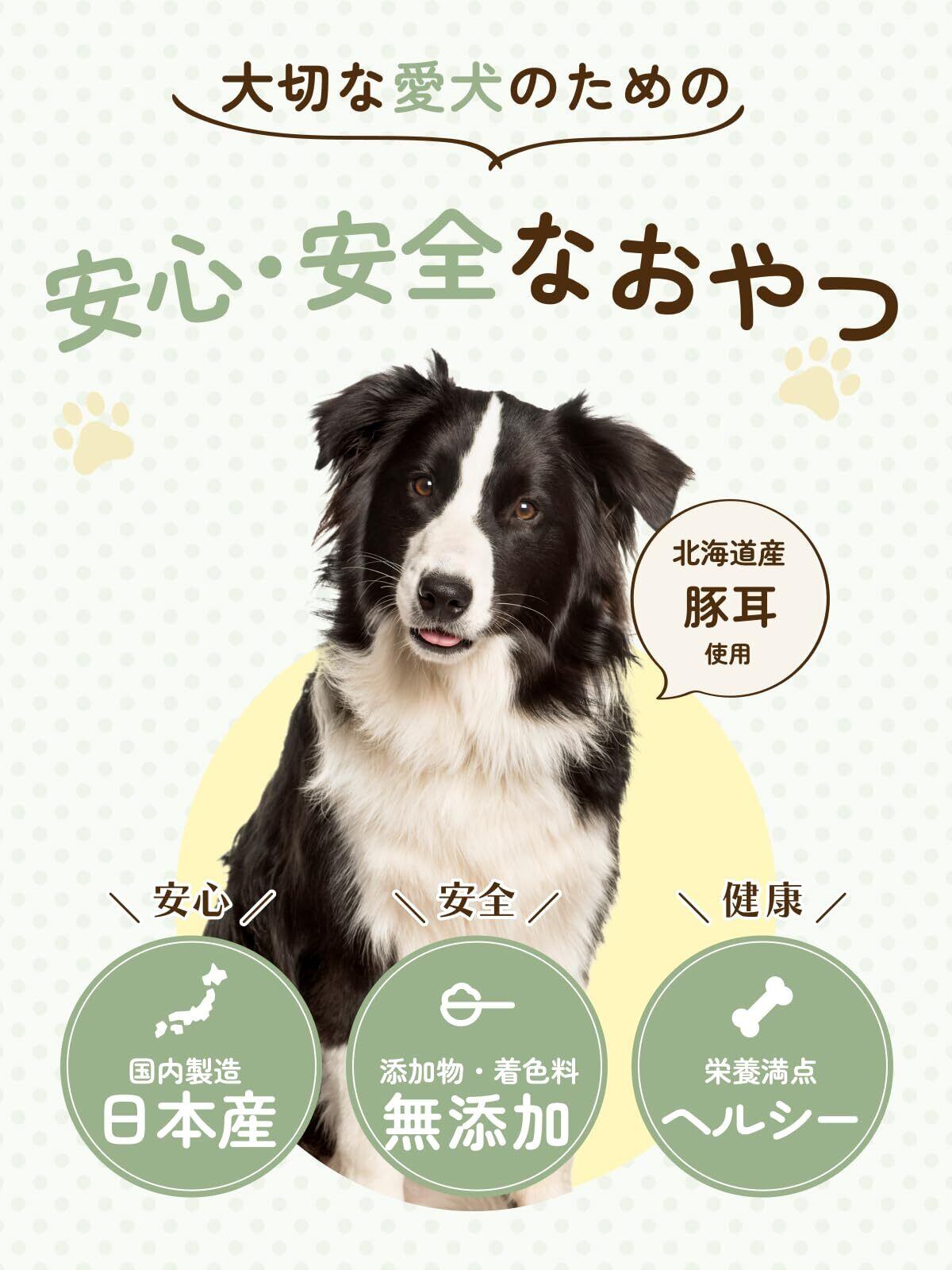 新鮮な北海道産の豚耳たぶのみを使用した、素材そのままのおやつですじっくりと乾燥させて旨味を凝縮しており、無添加・無着色なので、安心して与えて頂けます豚耳は低カロリーで嗜好性が高く、コラーゲン、ビタミンE、カルシウムを豊富に含んでいます程よく弾力があって嚙み応えが抜群なので、わんちゃんのストレス発散や歯磨き効果にも期待できます適度に長持ちするおやつなので、お留守番の際にもおすすめです小麦粉などの穀物を一切使用していないため、穀物アレルギーのわんちゃんにも安心して与えて頂けます