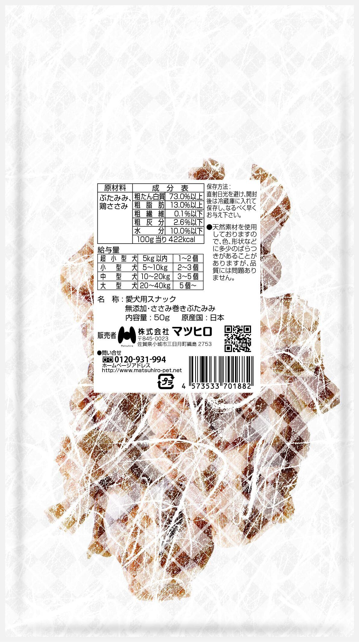 ワンちゃんの大好きな豚耳に鶏ささみを巻き、無添加製法で仕上げました。一口サイズで与えやすくなっています。