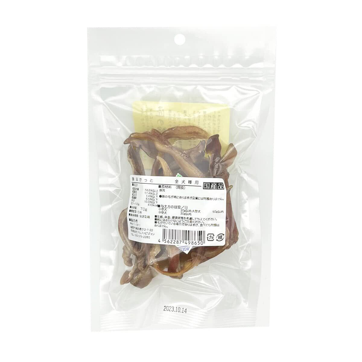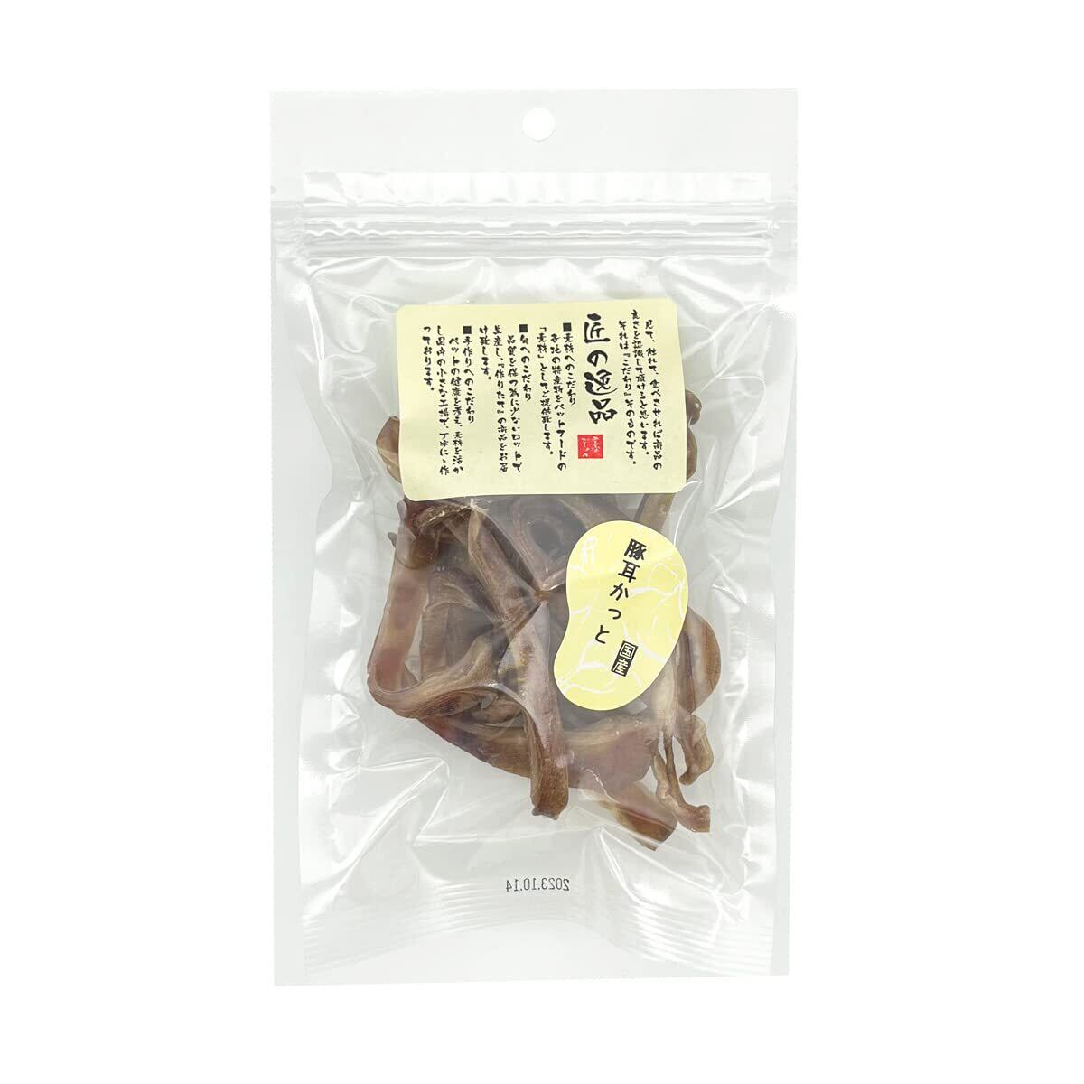 厳選素材を使った「こだわり」商品です。わんちゃんの健康を第一に考え、素材感を重視し、ひとつひとつ丁寧に手作業で作りました。安心安全の国産無添加。【原材料】豚耳【成分値】粗たん白質74.6%以上、粗脂肪17.4%以上、粗灰分1.4%以下、粗繊維6.5、水分10.0%以下、カロリー:100gあたり 約410kcal