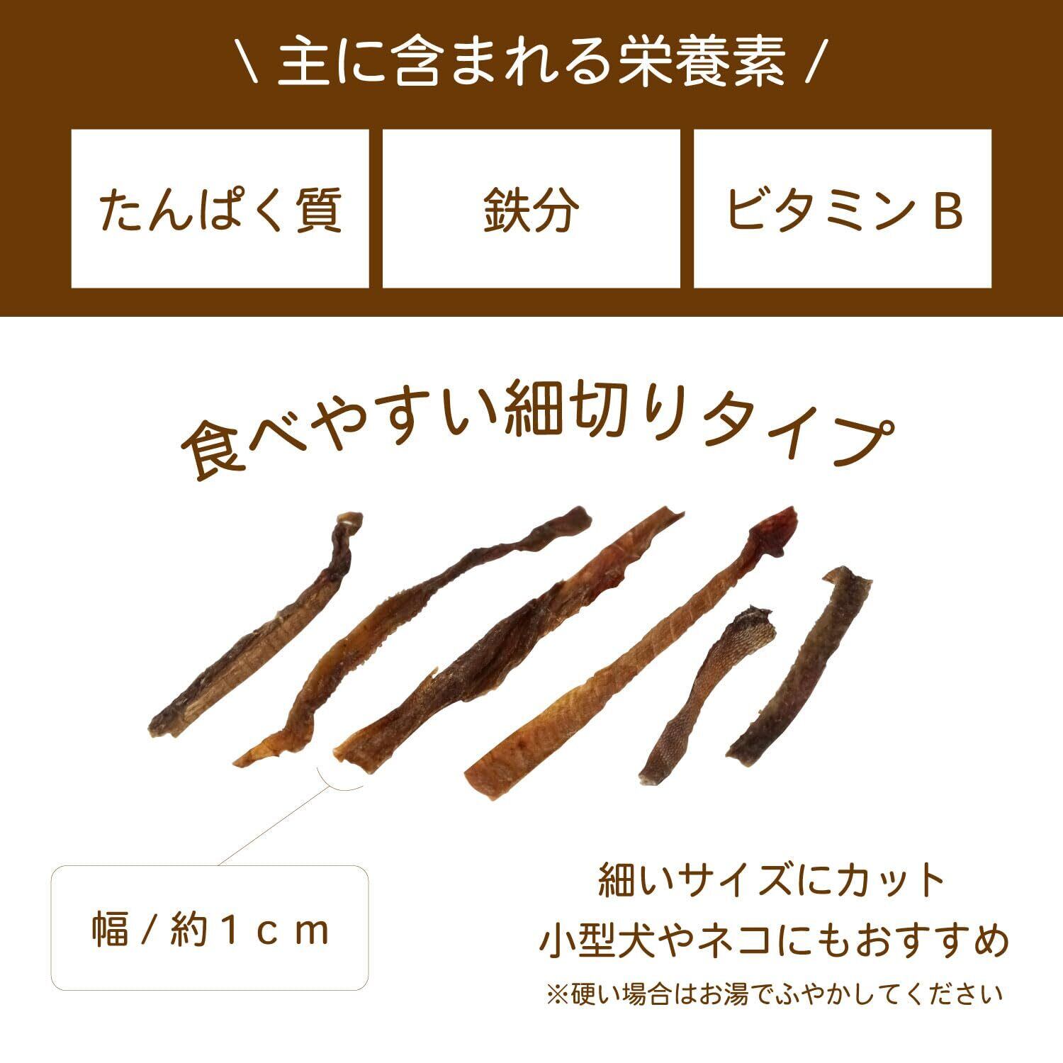 特徴: 食べやすい細切りタイプで猫ちゃんや高齢犬や小型犬にも与えやすく、しつけのご褒美にも便利です