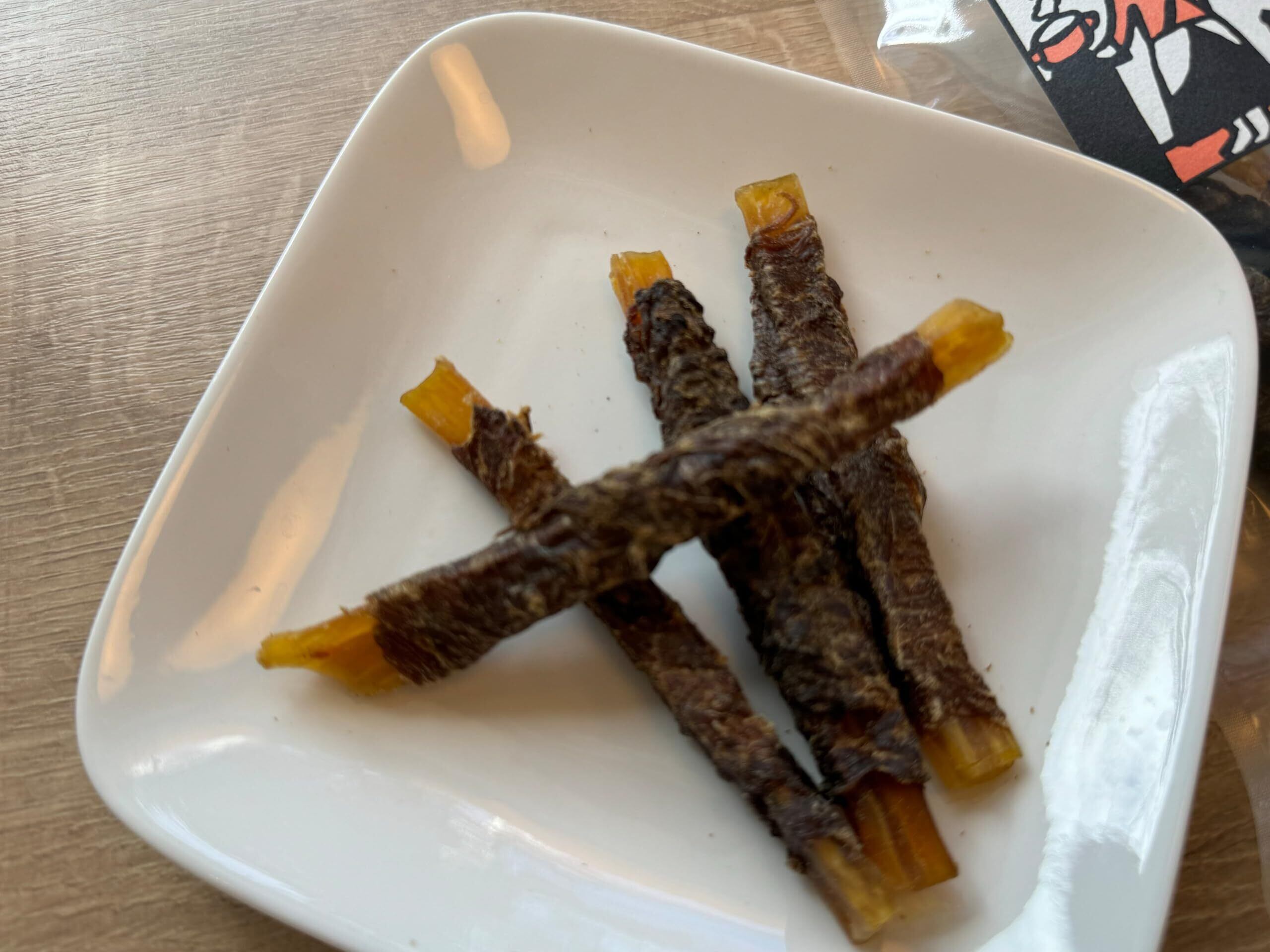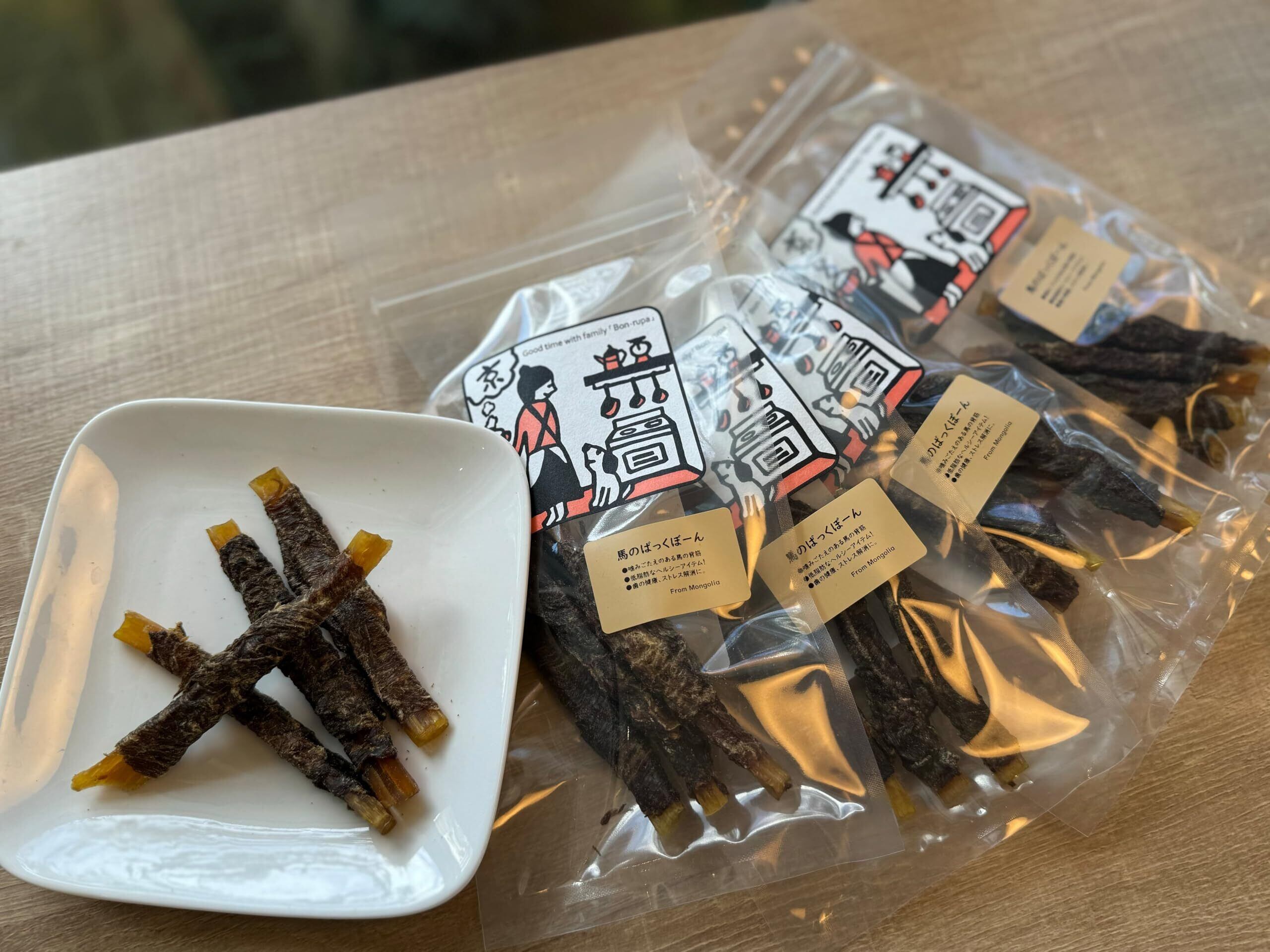 馬の背筋に馬肉を巻いた犬のおやつです。カリカリッガリガリッと噛むことで、ストレス解消にもなります。大自然のモンゴルで育った馬から作られており、高品質な馬肉を使用しています。噛み応えのある食感と上質な味わいを堪能してください。