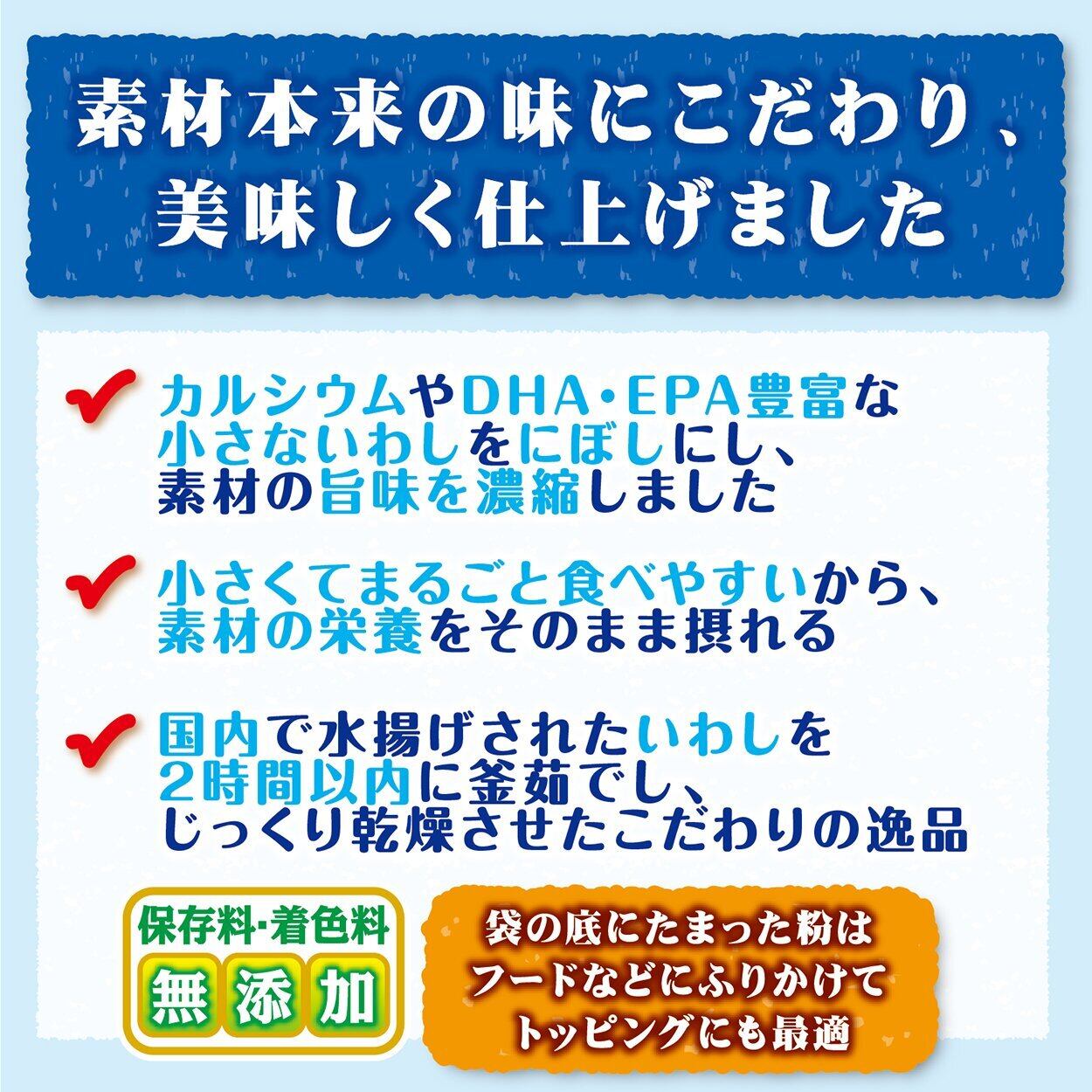 国内で水揚げされたいわしを2時間以内に釜茹でし、じっくり乾燥させたこだわりの逸品。カルシウムやDHA・EPA豊富な小さないわしをにぼしをまるごと使用しているから素材の栄養をそのまま摂ることができます。食品添加物無添加。