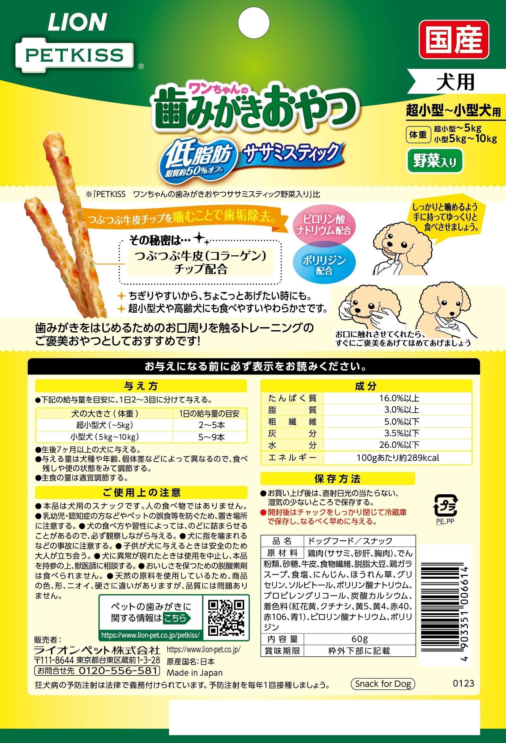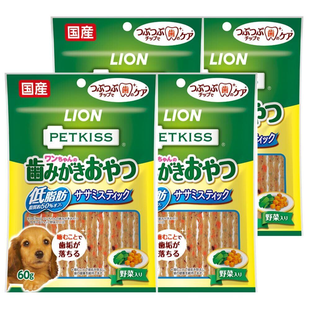 ライオン PETKISS ワンちゃんの歯みがきおやつ 低脂肪ササミスティック 野菜入り 4個パック 低脂肪野菜入り 60グラム (x 4) (まとめ買い)