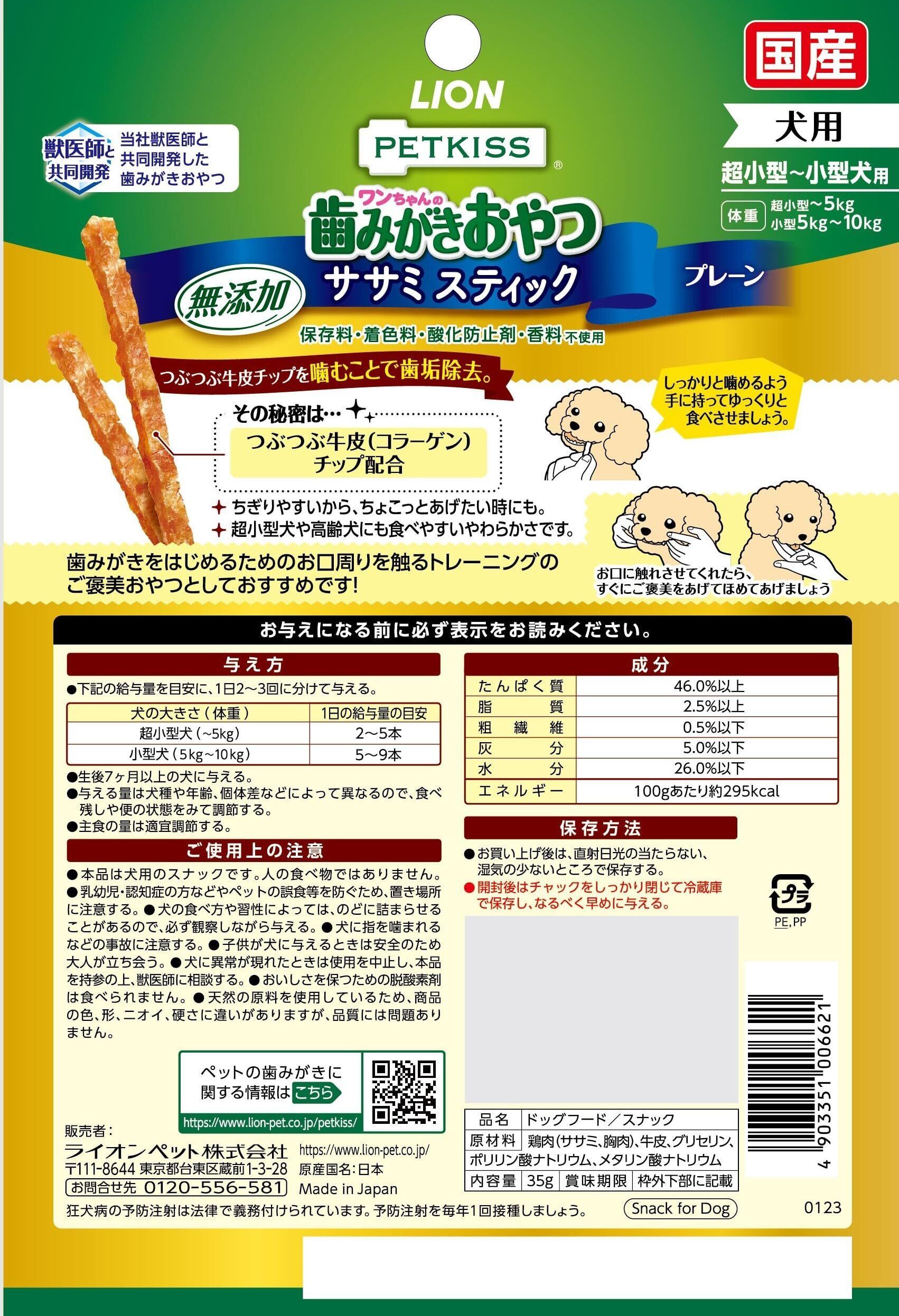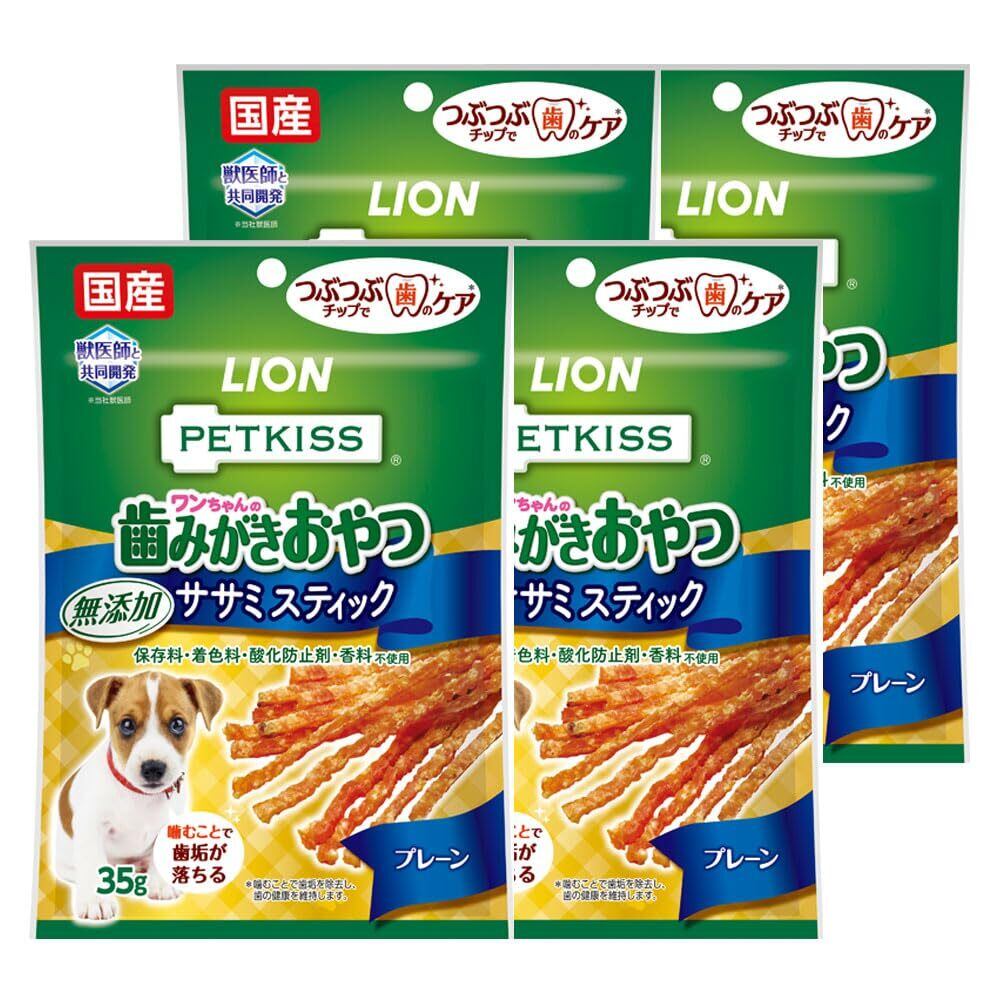 ライオン PETKISS ワンちゃんの歯みがきおやつ 無添加ササミスティック プレーン 4個パック チキン 無添加プレーン 35グラム (x 4) (まとめ買い)