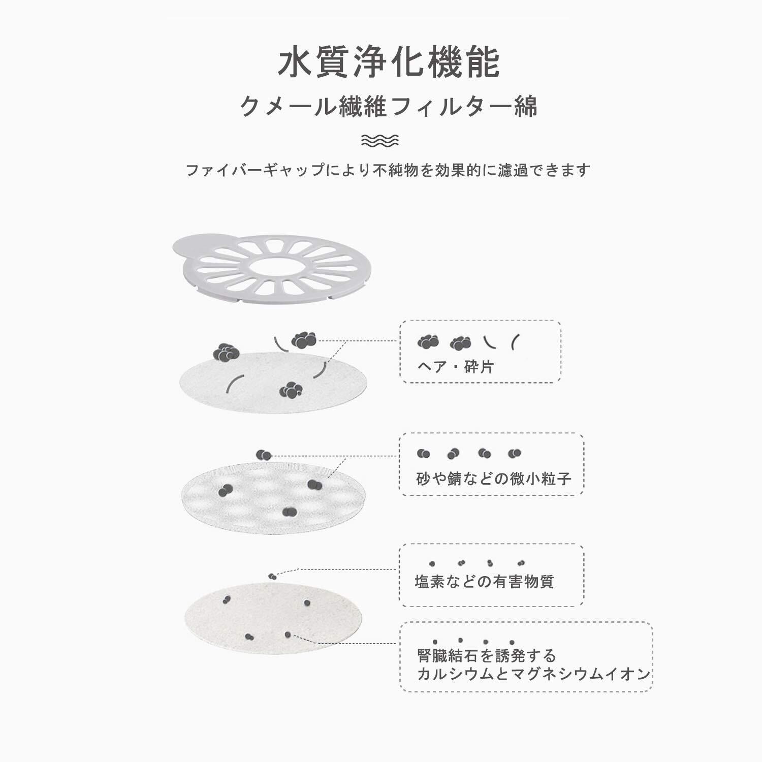 【水質浄化機能を備える水飲み器】カタツムリ殻の貯水筒が密閉設計で、外部からホコリ等の汚れを防ぎます。貯水筒から水を自動的に補給する時、フィルター付きの犬用みずのみ器は、水道水を軟水化し、皮毛、ほこり等汚れを濾過して、水を新鮮な状態に保つことができます。愛犬、愛猫に最も美味しい水を提供します。※この給水器はフィルター3枚付きです。ご注意:付属フィルターの内1枚は、事前に水飲みトレイの下にセッティングされております。
