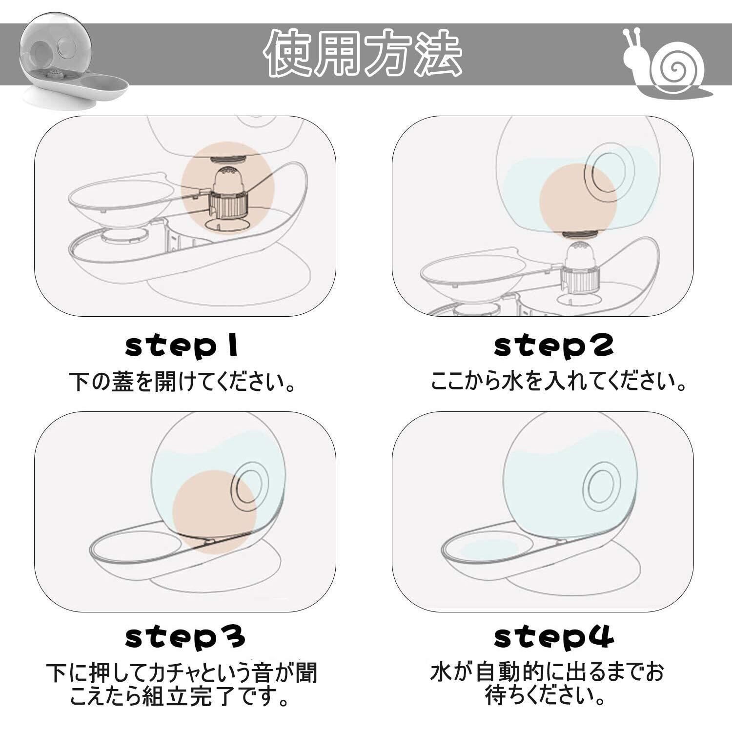 【使用方法】 Step1 給水タンクの底部の両側で手を置き、回せずに給水タンクを直接に上に引き抜けます。或いは、水飲みトレイを片手で押しながら、給水タンクを片手で片側を浮かして引いて外します。(給水タンクを回転しないでください) Step2 給水タンクの蓋を開けて水を入れた後、蓋を締めます。 Step3 給水タンクを台座へ押して「カチャ」と音が聞こえれば組立完了です。