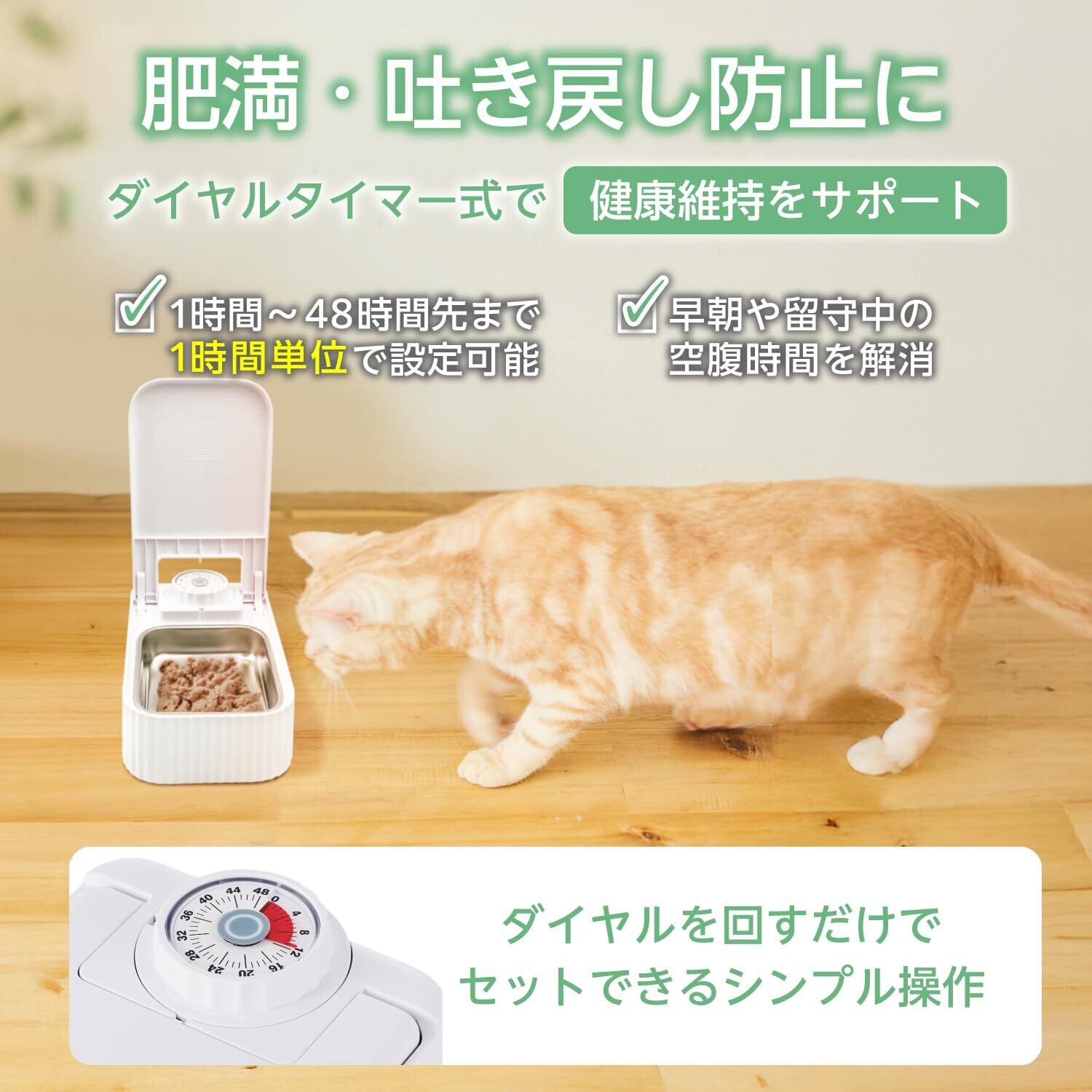 タイマーでセットした時間に蓋が開くことで、早朝や留守中にも給餌が可能。長時間の空腹を避けて肥満防止や吐き戻し防止に役立つ、ダイヤルタイマー式の自動給餌器です。