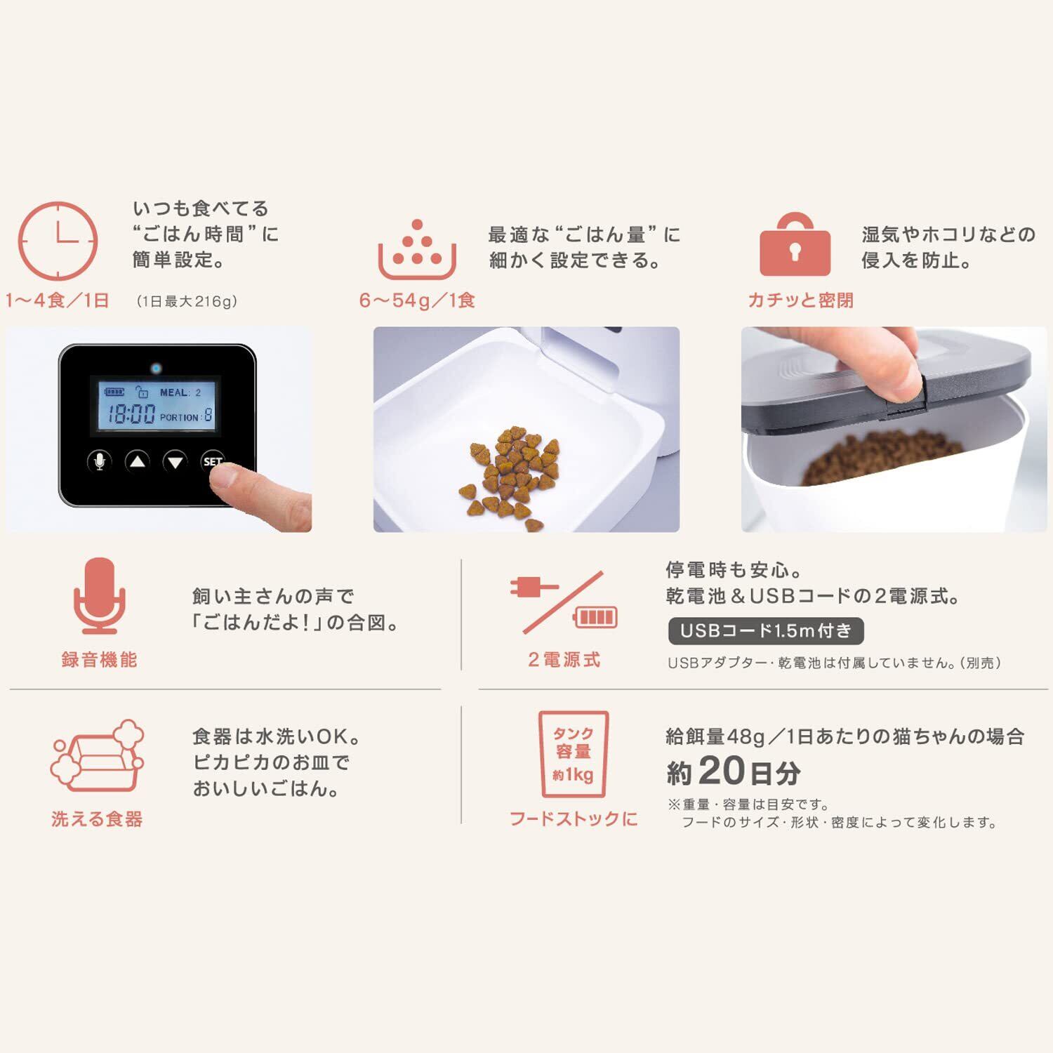 ●タンク容量約1kg(3L)のフードストッカーがついたドライフード専用自動食器/自動給餌機。●1日最大4回(食)の正確な時間に1食6~54g(6g単位)の正確な量を提供。●録音機能付。フードを提供するときに飼い主さんの声で合図することもできる。●停電時のリスク回避にもなる乾電池とUSBコードの2電源式。(乾電池とUSB用アダプターは付属していません)●直径2~12mm、厚み12mm以下のフードに適合。ストッカー部のふたはカチッと閉まり、食器部は水洗いできる。 使用方法 取扱説明書の記載事項に従い、電源を入れ、フードを入れて、現在時刻を設定したのち、給餌回数、給餌時刻を設定したから使用する。