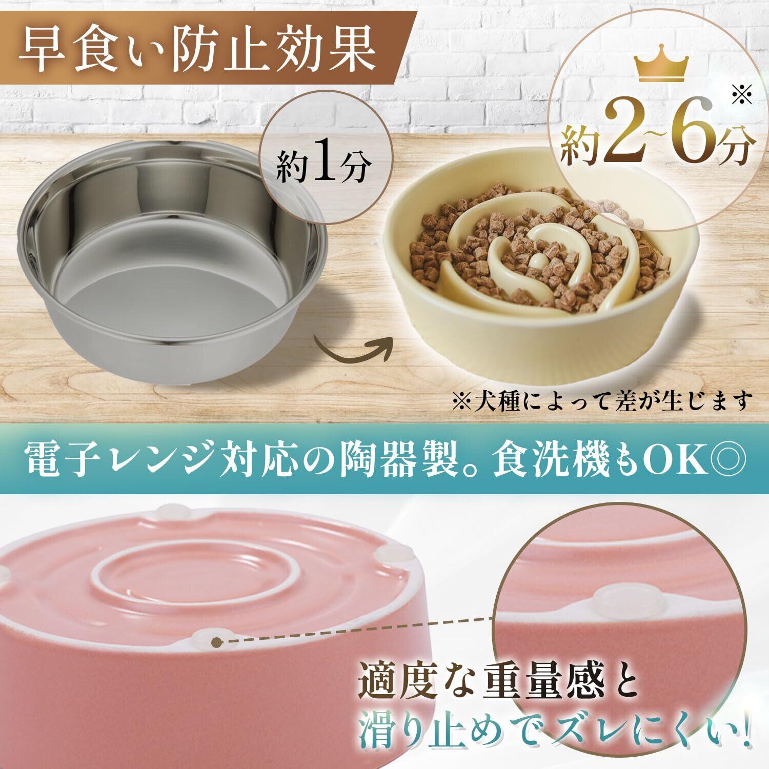 【滑りにくい安定設計・ストレスフリー】重量のある陶器製で、さらに滑り止めが付属しているため、食事中にズレにくく安定感抜群。ペットが快適に食事できるよう、ストレスを最小限に抑える工夫が施されています。フードボウルが動かないことで、食事に集中しやすくなります。