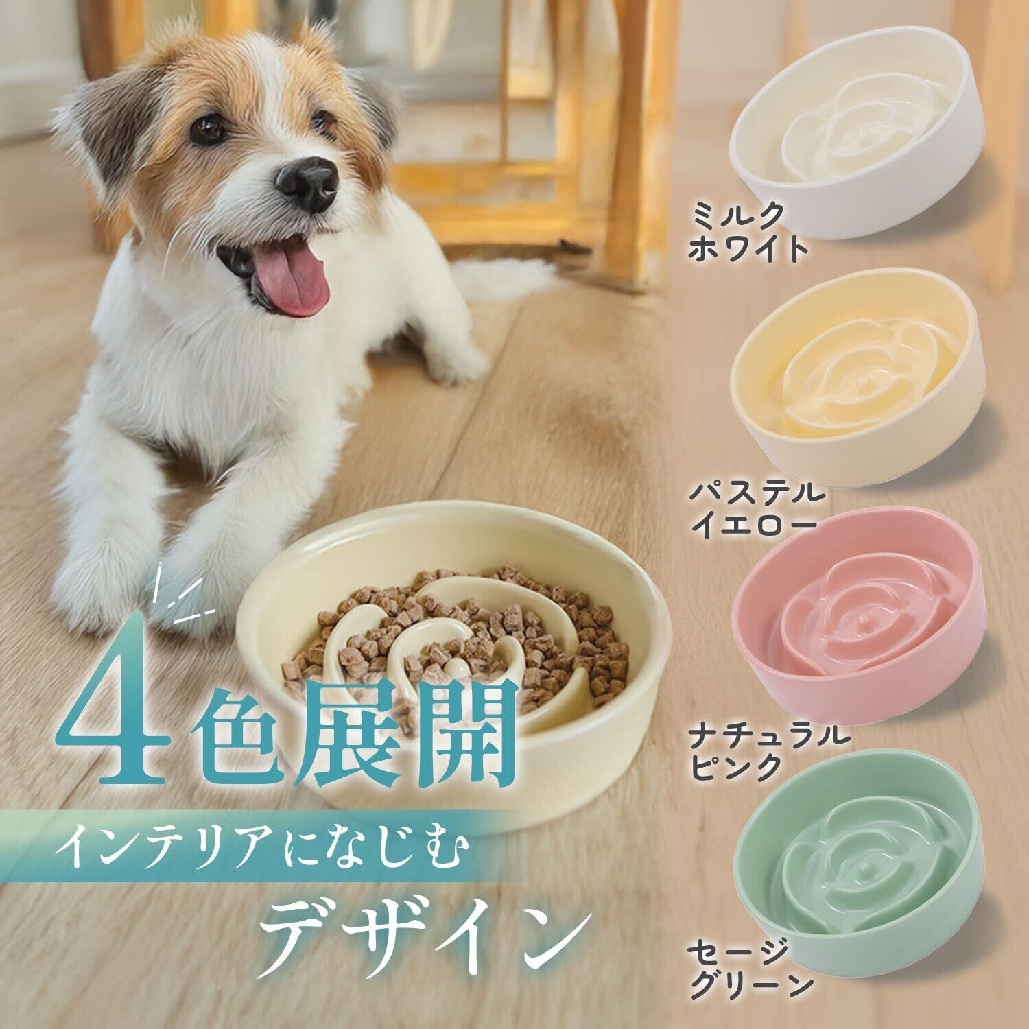 【4色展開・インテリアになじむデザイン】お部屋の雰囲気を選ばない、優しいカラーを4種類ご用意。シンプルかつ上品なデザインで、インテリアに自然と溶け込みます。ペットの食事スペースをおしゃれに演出できるフードボウルです。