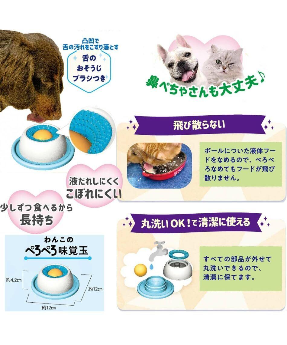 ●転がるボールについた分だけ舐めれる、おいしくて楽しい時間が長く続く液体フード用食器。●液体のペットフードやペットの牛乳をゆっくりぺろぺろできる。●わんちゃんの舐め方を研究し、回りを舌のお掃除ブラシに凸凹を舐めて舌の汚れをこすり落とす。●周りに飛び散らず、鼻ぺちゃさんも大丈夫な設計。●分解、丸洗いOK、すべり止め付き、日本製。