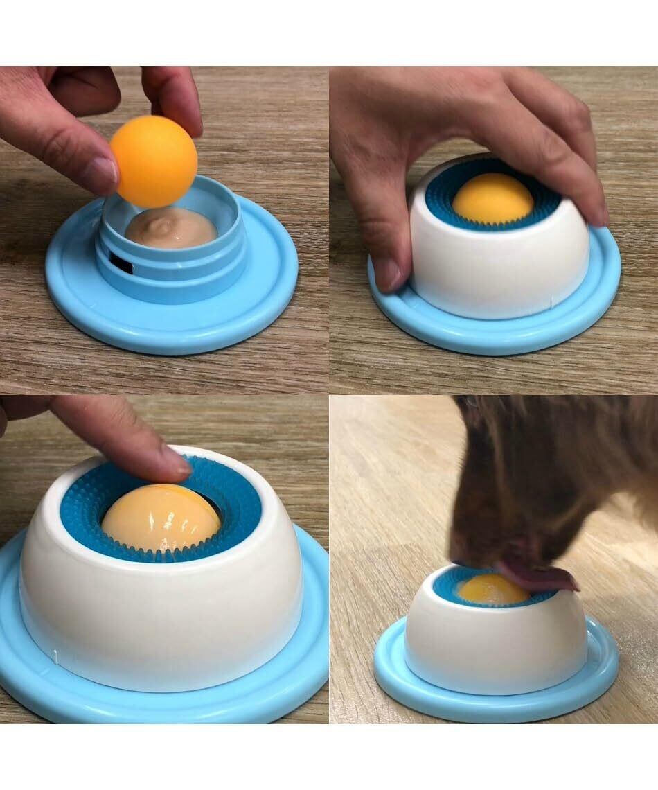 転がるボールについた分だけ舐めれる、おいしくて楽しい時間が長く続く液体フード用食器。分解、丸洗いOK、すべり止め付き、日本製。