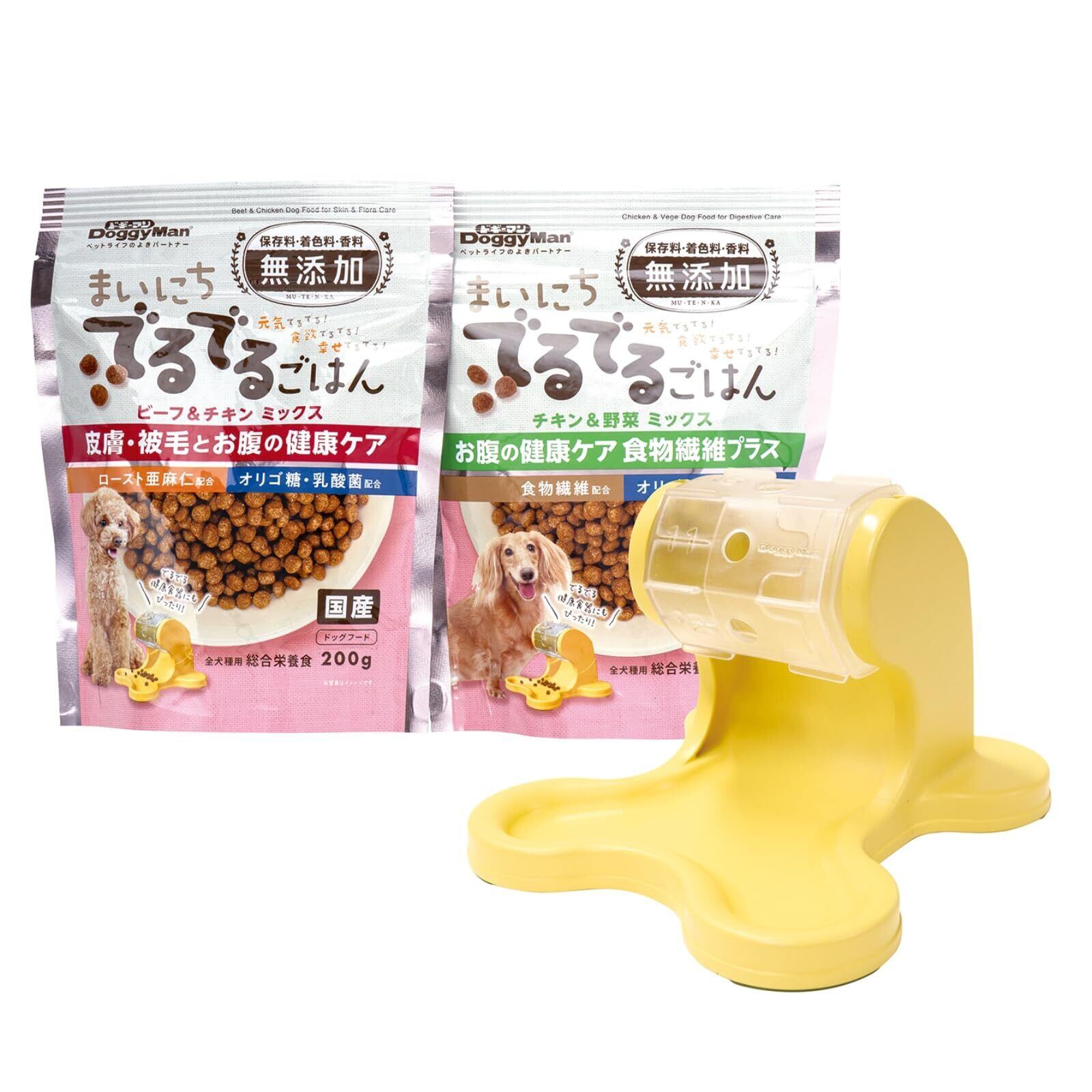 ●まいにちでるでるごはんの皮膚・被毛とお腹の健康ケア 200gと お腹の健康ケア 食物繊維プラス 200g、そして、でるでる自飯器(健康食器)のセット。