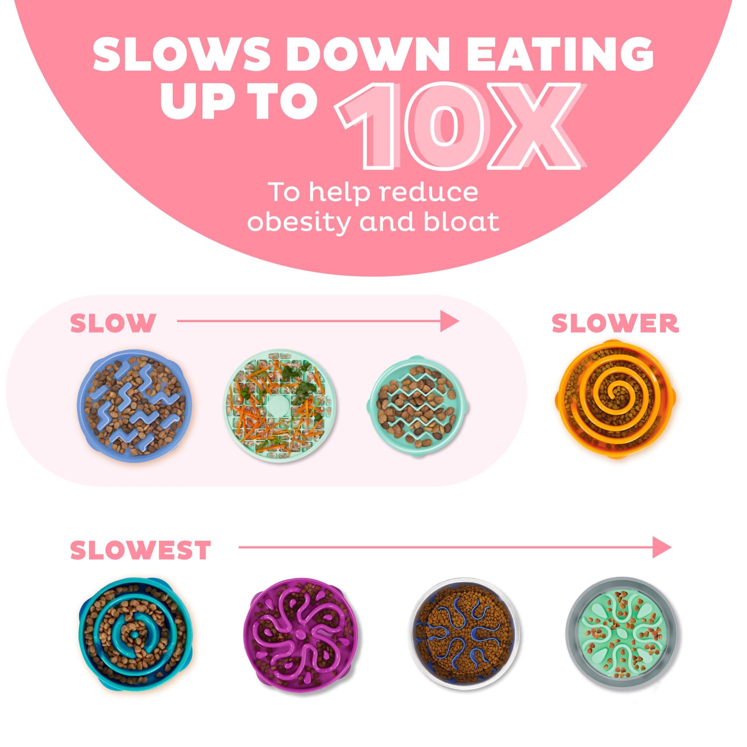 約10倍(※)食事の時間が長くなります。 ※平均 迷路のような突起が食べるスピードをスロウダウンさせます。フードの吐き戻し、肥満、鼓脹症のリスクの低下に効果があります。底面には滑り止めが付いているので、 鼻先でボウルを押してしまうワンちゃんにも最適です。