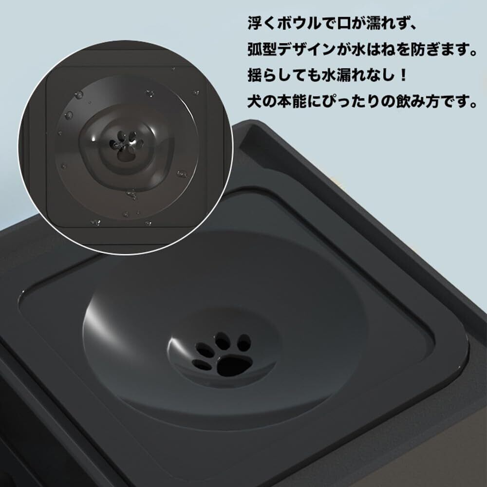 【こぼれ防止水飲み器】 1.6Lの大容量を提供し、中型犬、大型犬、多頭飼い家庭の一日の飲水ニーズを満たします。浮動プレート設計を採用しており、水のこぼれを効果的に防ぎ、床を乾いた状態に保ちます。浮動プレートはほこりや毛などの異物が水に混入するのを防ぎ、飲むたびに清潔で健康的な水を提供します。また、広口設計によりペットの口周りの毛が濡れるのを防ぎます。