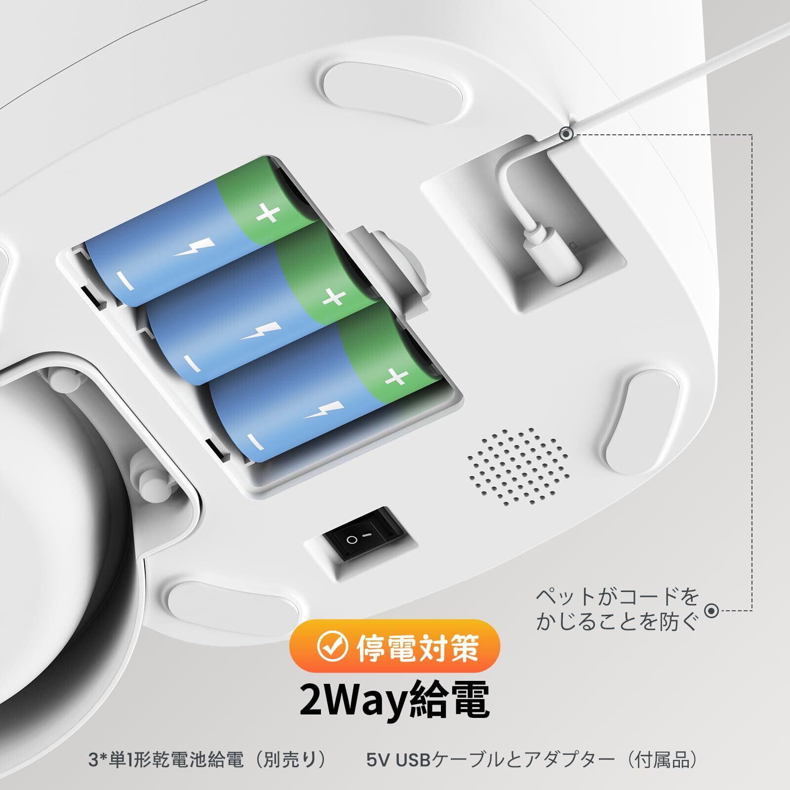 【低消費電力・2Way給電でいつでも確実に作動】省エネ設計の餌やり機。付属の電源コードと電源アダプターを使用することで、少ない電力でスムーズに動作する。万一の停電時にも、ACアダプターと乾電池(単1形3本/別売)の二重のバックアップで、大切な給餌スケジュールを確実に継続。※乾電池駆動時は消費電力の高いカメラ機能はオフになります。電源の心配なく、ペットの食事管理という核心機能を24時間する、頼もしい設計