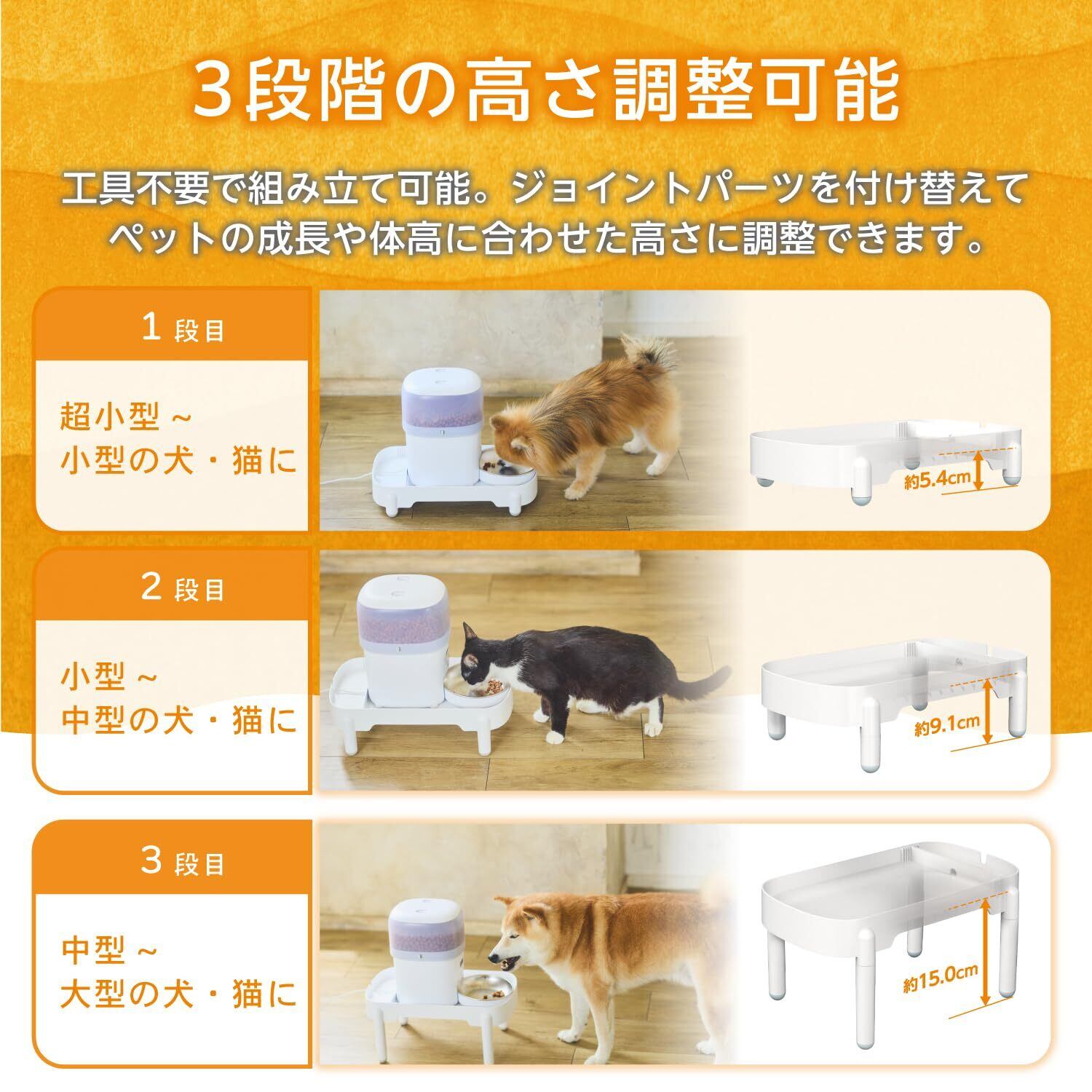 ペットの成長や体高に合わせて3段階の高さ調整が可能。高さ5.4cmから15.0cmまで設定できるため、超小型から大型まで幅広いワンちゃん・ネコちゃんにお使いいただけます。