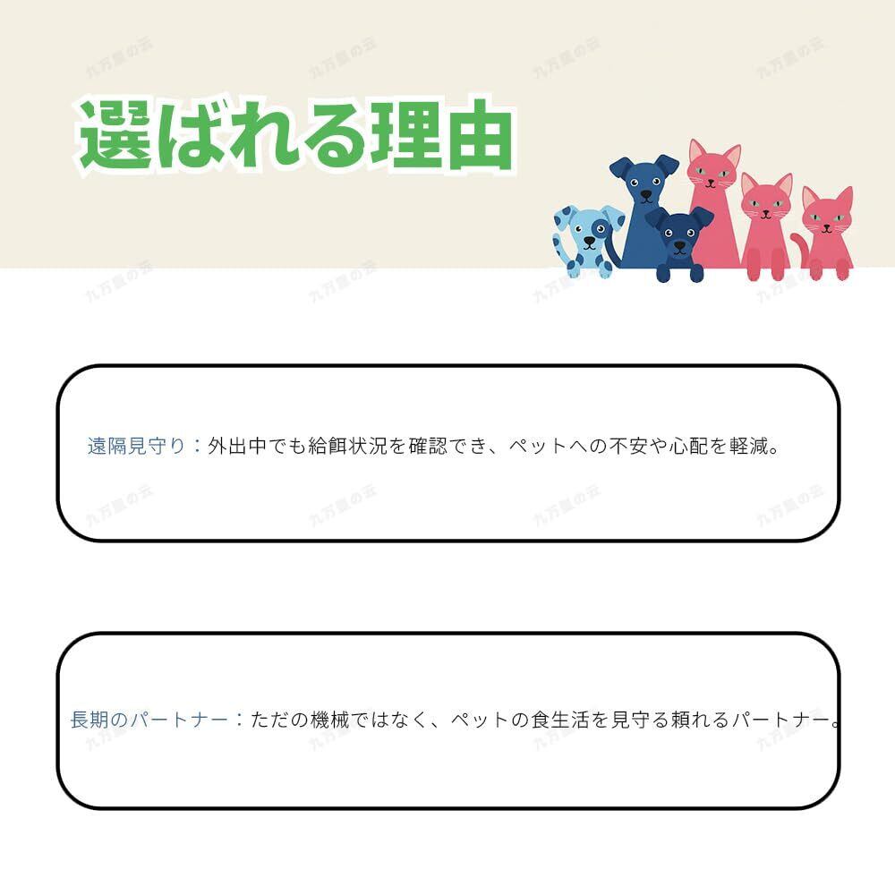 日本語版の取扱説明書はPDF形式でご提供しております。日语说明書が必要な場合は、カスタマーサービスまでお問い合わせください。ご入用の際はどうぞお申し付けください。Wi-Fiとモバイルアプリによるリモートコントロール:スマートフォンから1日最大6食分の食事のスケジュールを設定したり、家族とアクセスを共有したり、どこからでもペットの給餌スケジュールを確認できます(2.4GHzネットワークのみ対応)。️安心!本製品には、製造上の欠陥に対する1年間のが付いています。